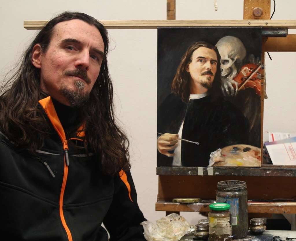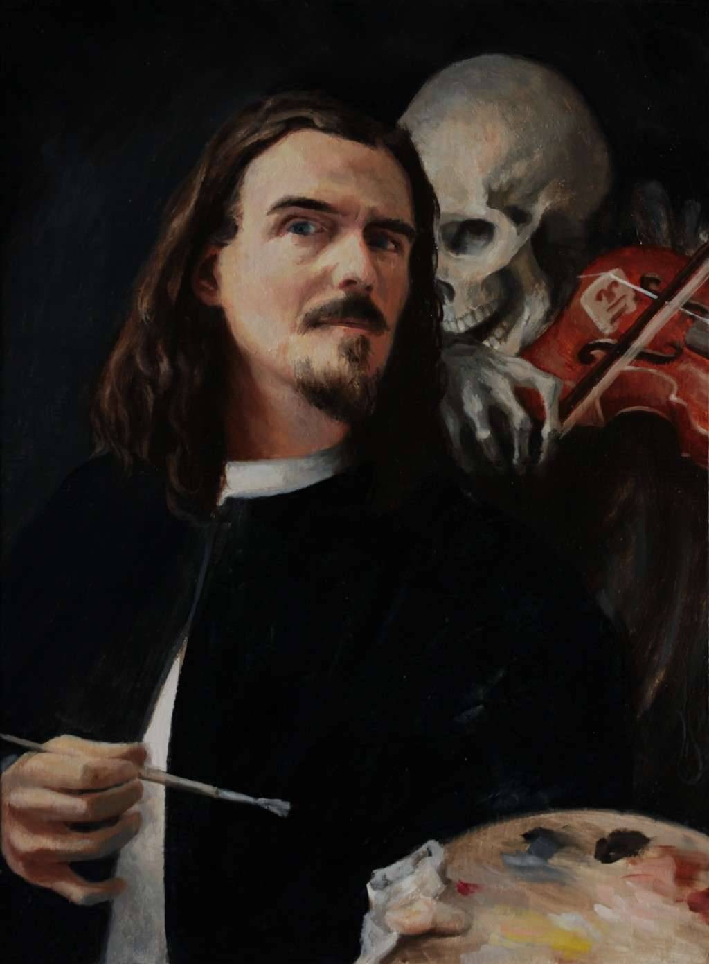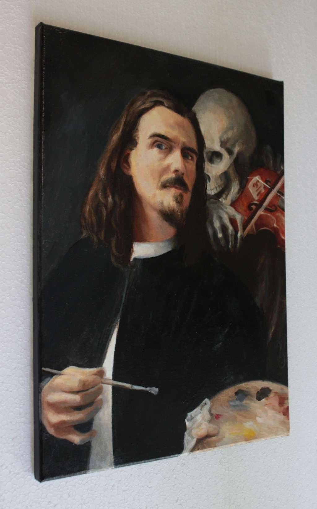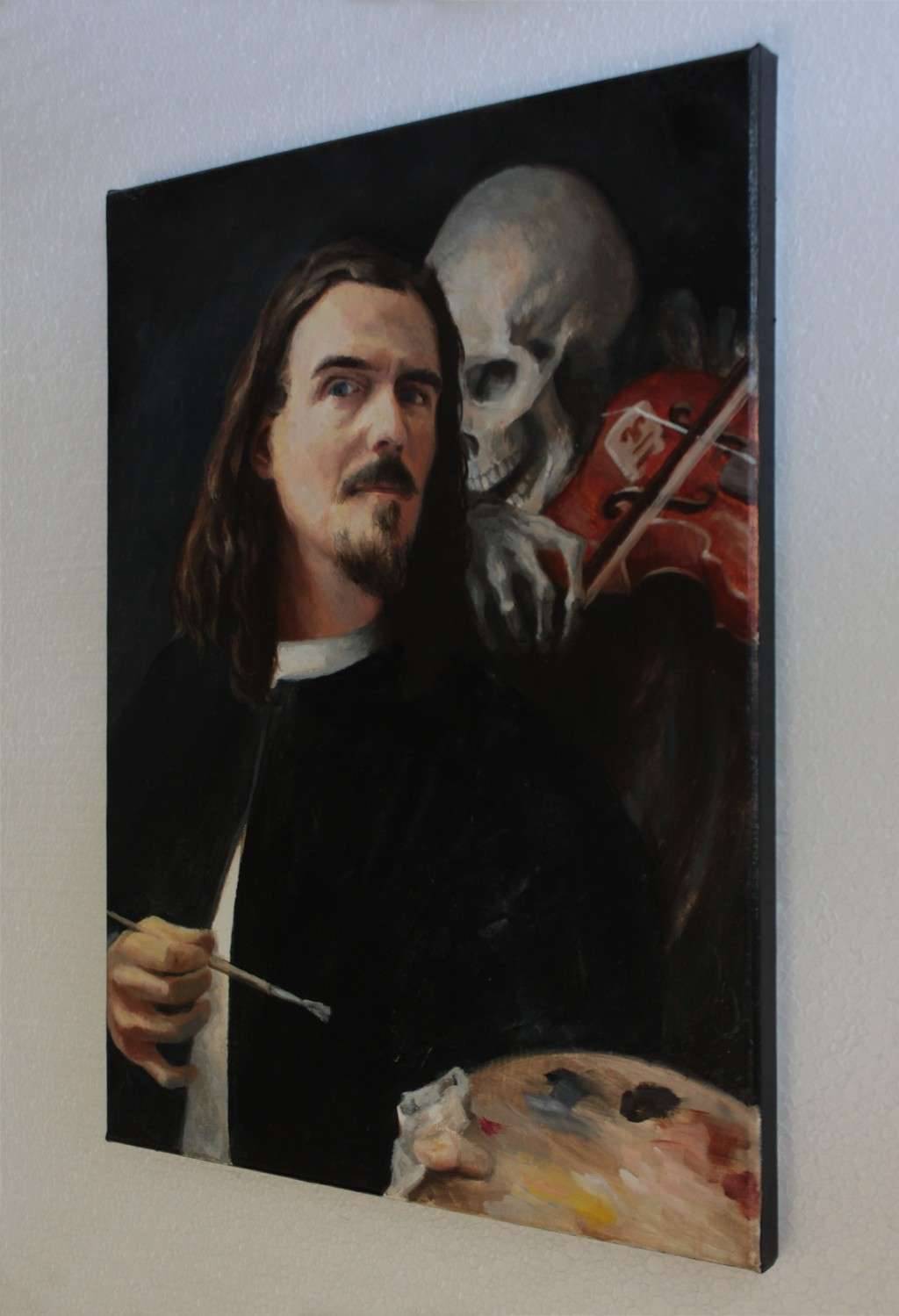 This painting was painted around Halloween. The self-portrait was inspired by Arnold Böcklin's own self-portrait. This is my first self-portrait in oil paint. I was working from a photo reference of myself edited into Böcklin's own painting.
