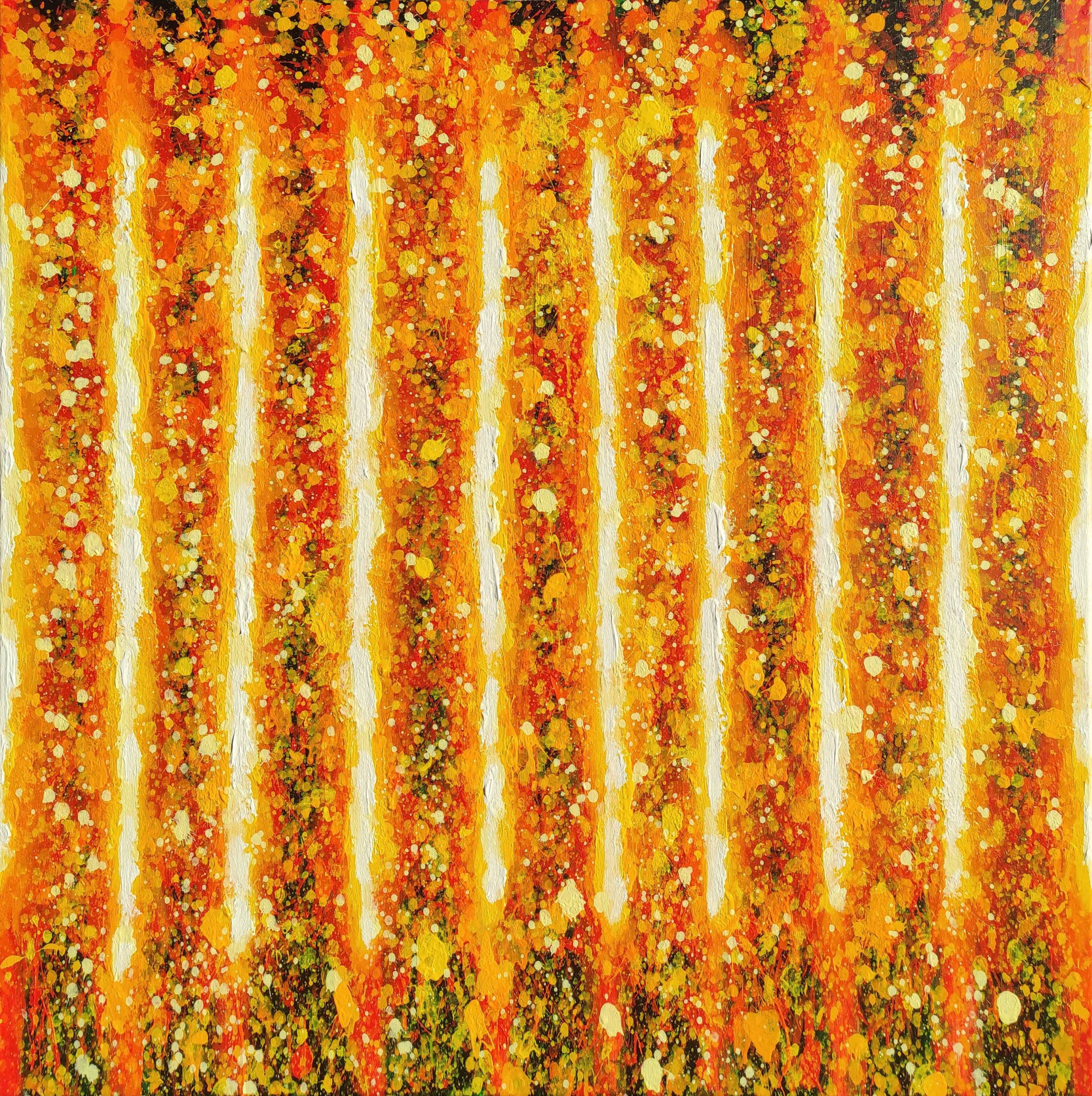 Ten obraz emanuje ciepłem i energią przez intensywne barwy pomarańczy, żółci i złota. Na pierwszy rzut oka widać rytmicznie ułożone pionowe linie, które pulsują niczym światła w ożywionym mieście. Paleta kolorów przywołuje ciepło letniego zachodu słońca, a drobne, wielobarwne plamki dodają tekstury i głębokości. Kompozycja jest dynamiczna, ale zachowuje równowagę, co sprawia, że obraz wydaje się niemalże wibrować przed oczami. Atmosfera tego dzieła jest pełna entuzjazmu, prawie jak podczas festiwalu. Artysta zastosował technikę kropkowania i chaotycznie nałożonych warstw farby, co nadaje obrazowi żywiołową strukturę i organiczny charakter. Technika przypomina styl znany jako "dripping", co dodaje warstwę modern art do całości. Obraz może wywołać mocne emocje, począwszy od radości, przez inspirację, aż po uczucie ciepła i komfortu. Moja siostra powiedziała: "Wygląda jak ognisty deszcz" i, hej, coś w tym jest! Czuje się, jakby ten obraz krzyczał "energy!" i przyciągał wzrok niczym magnes. Wpatrując się w to dzieło, można zanurzyć się w marzeniach o gorących letnich dniach, pełnych przygód i beztroski. To tak, jakby artysta chciał nas zabrać w podróż w miejsce pełne światła i ruchu, w odprężającą krainę daleko od zgiełku codzienności. Ten obraz działa na emocje jak jazzowa melodia, której rytm porywa nas od pierwszej chwili.
