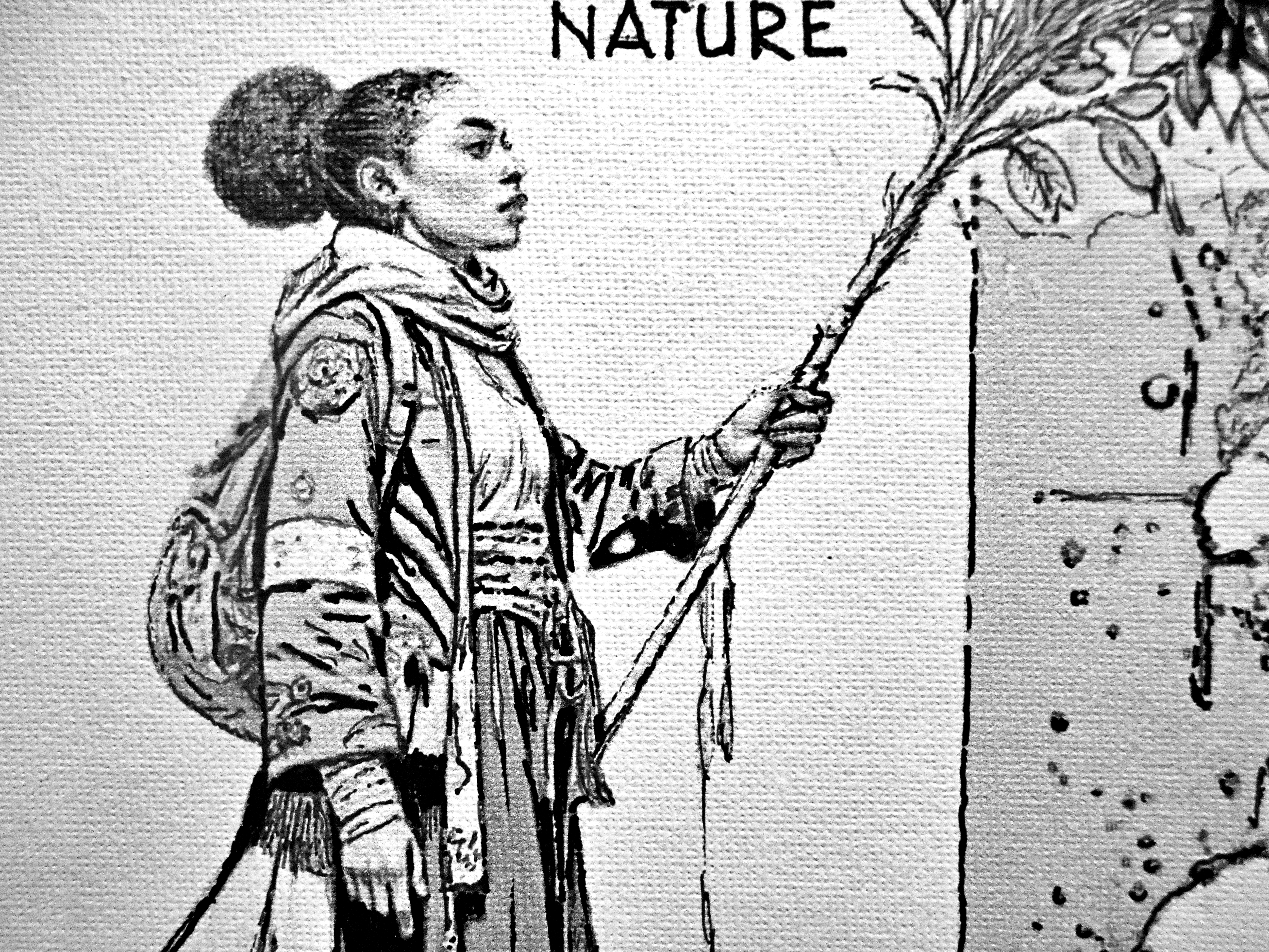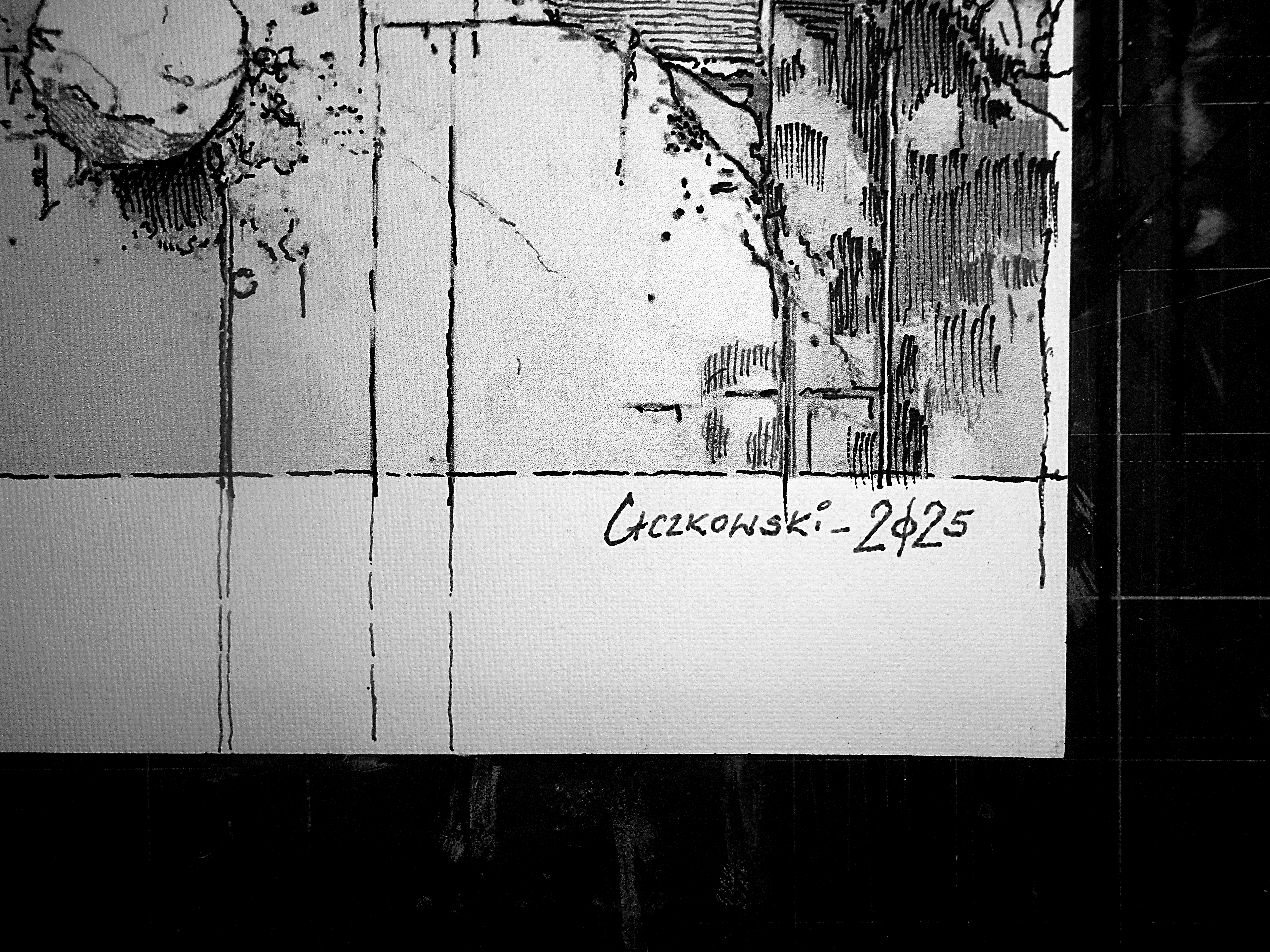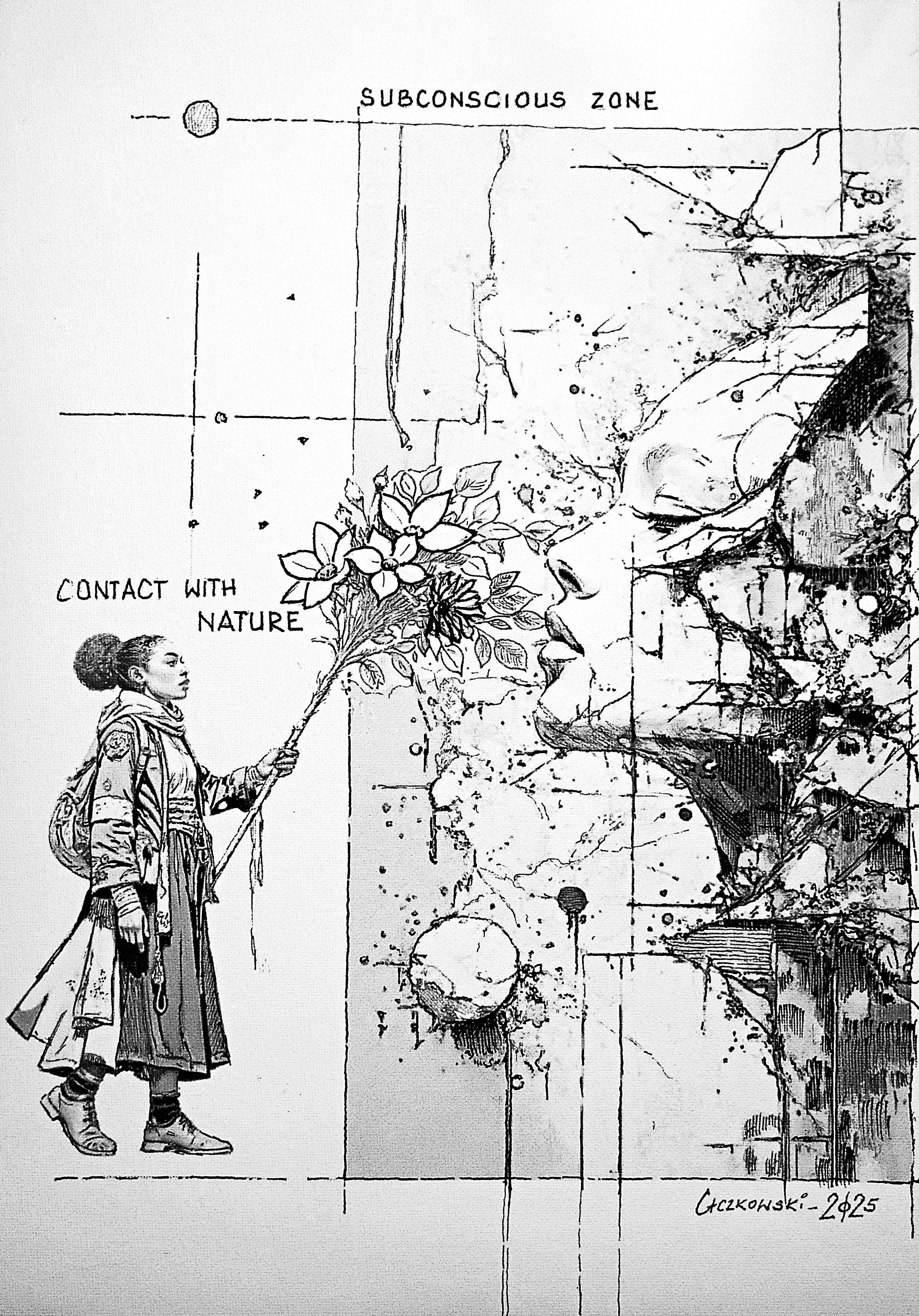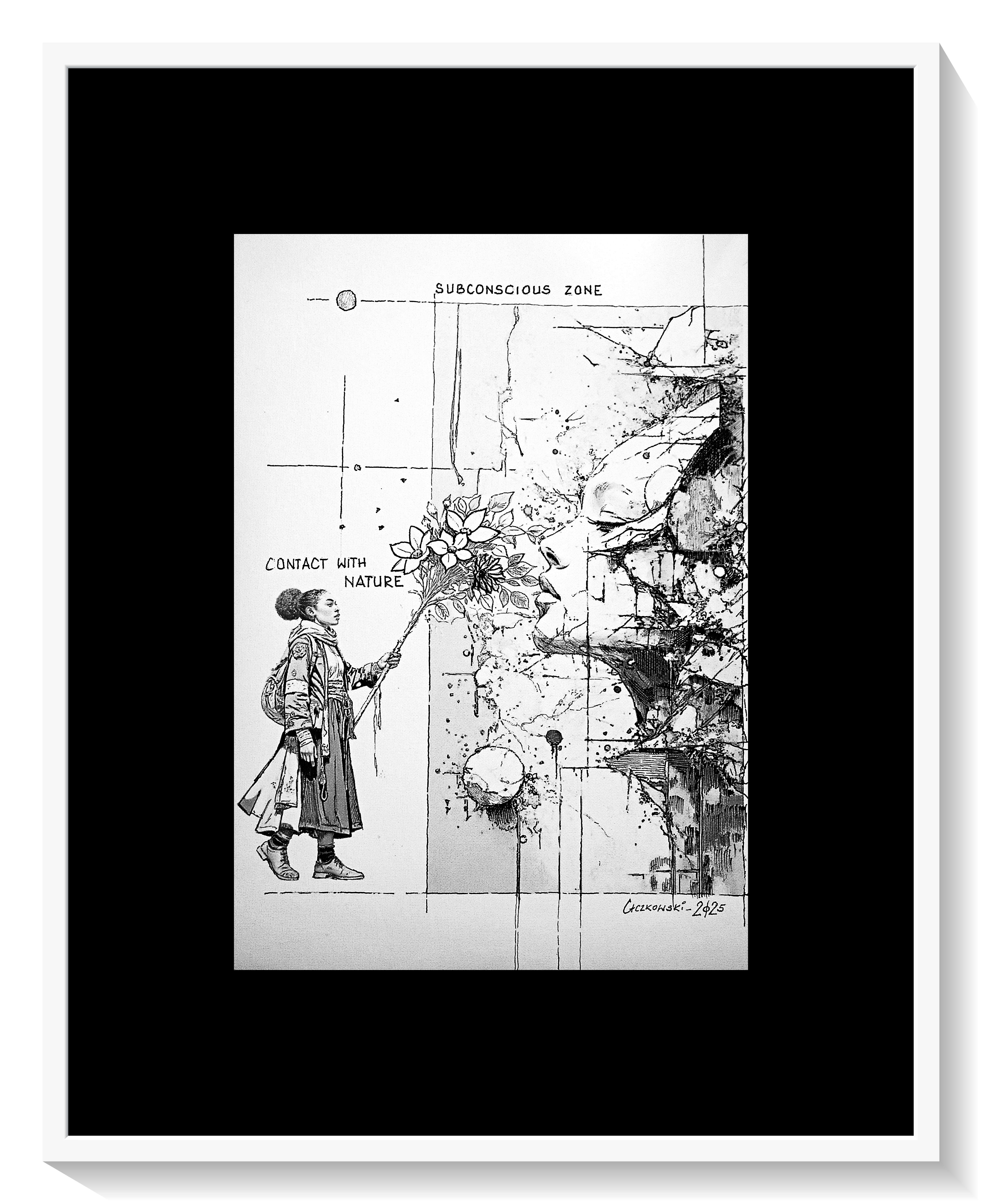 Obraz przedstawia dzieło, które intryguje swoją niebanalną kompozycją. Po lewej stronie widzimy młodą dziewczynkę trzymającą kwiaty. Kwiaty wydają się wibrować życiem dzięki delikatnym liniom, które wypełniają ten monochromatyczny świat. Po prawej stronie mamy twarz wyłaniającą się z czegoś, co przypomina ścianę lub skałę. Ta twarz, zamknięta w snach, zdaje się rozkoszować wonią kamieni i roślin. Atmosfera jest tajemnicza. To trochę jak sen, który pamiętasz, ale nie do końca. Artysta stworzył prace w technice czarno-białej, wykorzystując przerywane linie nadające obrazowi dynamikę i głębię. Ilustracja nawiązuje do strefy podświadomości – słowa „SUBCONSCIOUS ZONE” kierują nasze myśli w stronę ukrytych pragnień i marzeń. To dzieło budzi refleksję o połączeniu człowieka z naturą. Prosty akt oddychania, kontakt z naturą, staje się tutaj symbolicznym mostem między świadomością a podświadomością. Feel the connection, można by powiedzieć. Jest w tym coś bardzo osobistego, jakby artysta chciał, by każdy z nas na chwilę przystanął i zastanowił się nad własnym miejscem w świecie. Dla dziecka mogłoby to oznaczać myśl: "Ja też chcę takiego kwiata". Obraz pozostawia nas z uczuciem spokoju, ale i jakąś niepokojącą tęsknotą za czymś nie namacalnym. Cykl ilustracji - Rozmowa artysty z podświadomością - Tęsknota za utraconym światem.