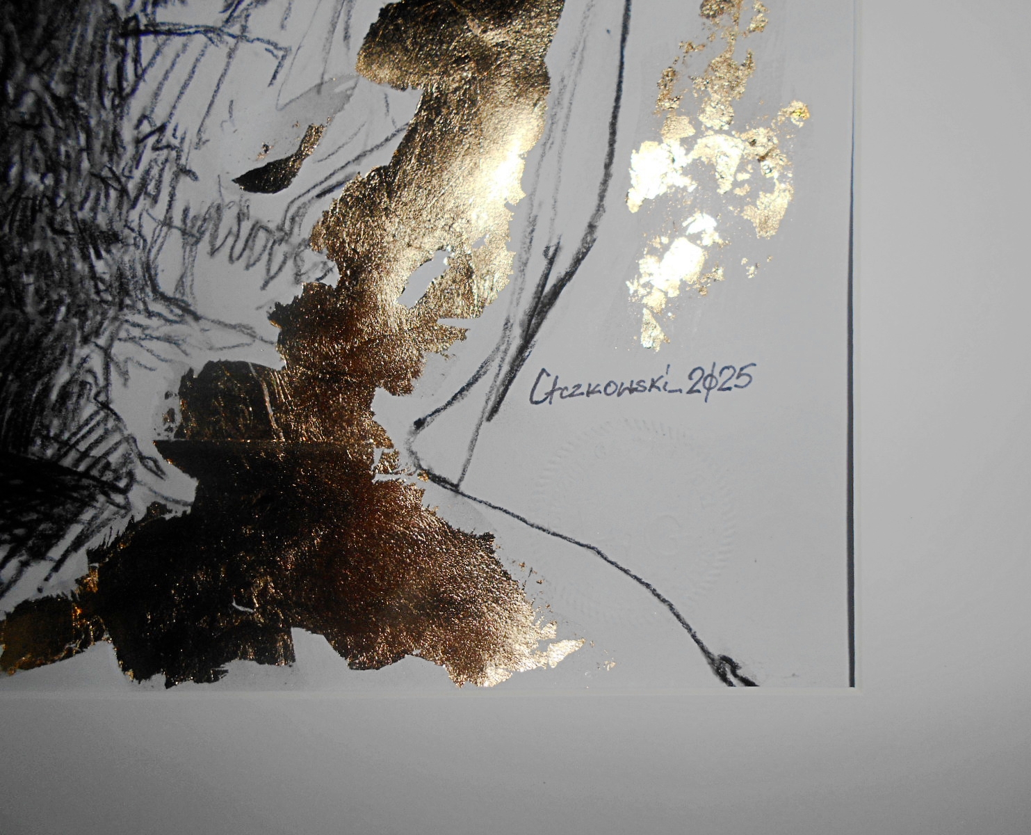 Na tym intrygującym obrazie, uchwycono postać kobiety zanurzonej w głębokiej zadumie. Ołówkowe kreski, delikatne i precyzyjne, tworzą subtelne cienie, które podkreślają wyraz jej twarzy. Short hair jest skręcone i pełne lekkości. Pomimo czarno-białej palety, złote akcenty dodają pracy wyjątkowego blasku, przyciągając wzrok i podkreślając szlachetność postaci. Jest w tym cos magicznego! Zastosowana technika łączy realistyczny rysunek z abstrakcyjnymi plamami złota, tworząc niesamowity kontrast. Atmosfera obrazu jest pełna melancholii i pewnego rodzaju nostalgii. To chwila zatrzymania w czasie, kiedy myśli płyną gdzieś daleko. Można by poczuć jakby czas zwolnił. Styl artystyczny przypomina klasyczne portrety, ale z nowoczesnym twistem dzięki tym iskrzącym złotem detalom. Dziecko powiedziałoby, że Panie na obrazie jest smutna i myśli o czymś ważnym. Ten obraz skłania do refleksji nad przemijaniem i ulotnością chwili. Emocje obecne tutaj są ciche, lecz głębokie. Obserwator może znaleźć w tej twarzy własne zmartwienia, swoje marzenia czy tęsknoty. Ten artwork to rzadka mieszanka tradycji i współczesności, która może chwycić za serce. Rysunek klasyczny portret w różnych ujęciach aktorki Marilyn Monroe. Wykonany przez artystę ołówkami i węglem w kredce . Artysta dodaje złote płatki szlagmetalu dodają atrakcyjności monochromatycznej pracy i wpisuje się do stylu glamur. Może być doskonałym prezentem. Jej miejsce to salon , sypialnia, gabinet. Praca jest oprawiona w delikatną ramkę z passe-partout na którą można nałożyć bardziej strojne obramowanie wg własnego gustu i uznania. Marilyn Monroe (wym. /ˈmærəlɪn mənˈroʊ/), właśc. Norma Jeane Mortenson (ur. 1 czerwca 1926 w Los Angeles, zm. 4 sierpnia 1962 tamże) – amerykańska aktorka, modelka, piosenkarka i producentka filmowa. Gwiazda filmowa, ikona kultury popularnej[1] i seksbomba lat 50. i 60. XX w. American Film Institute umieścił ją na szóstym miejscu na liście największych aktorek wszech czasów (The 50 Greatest American Screen Legends