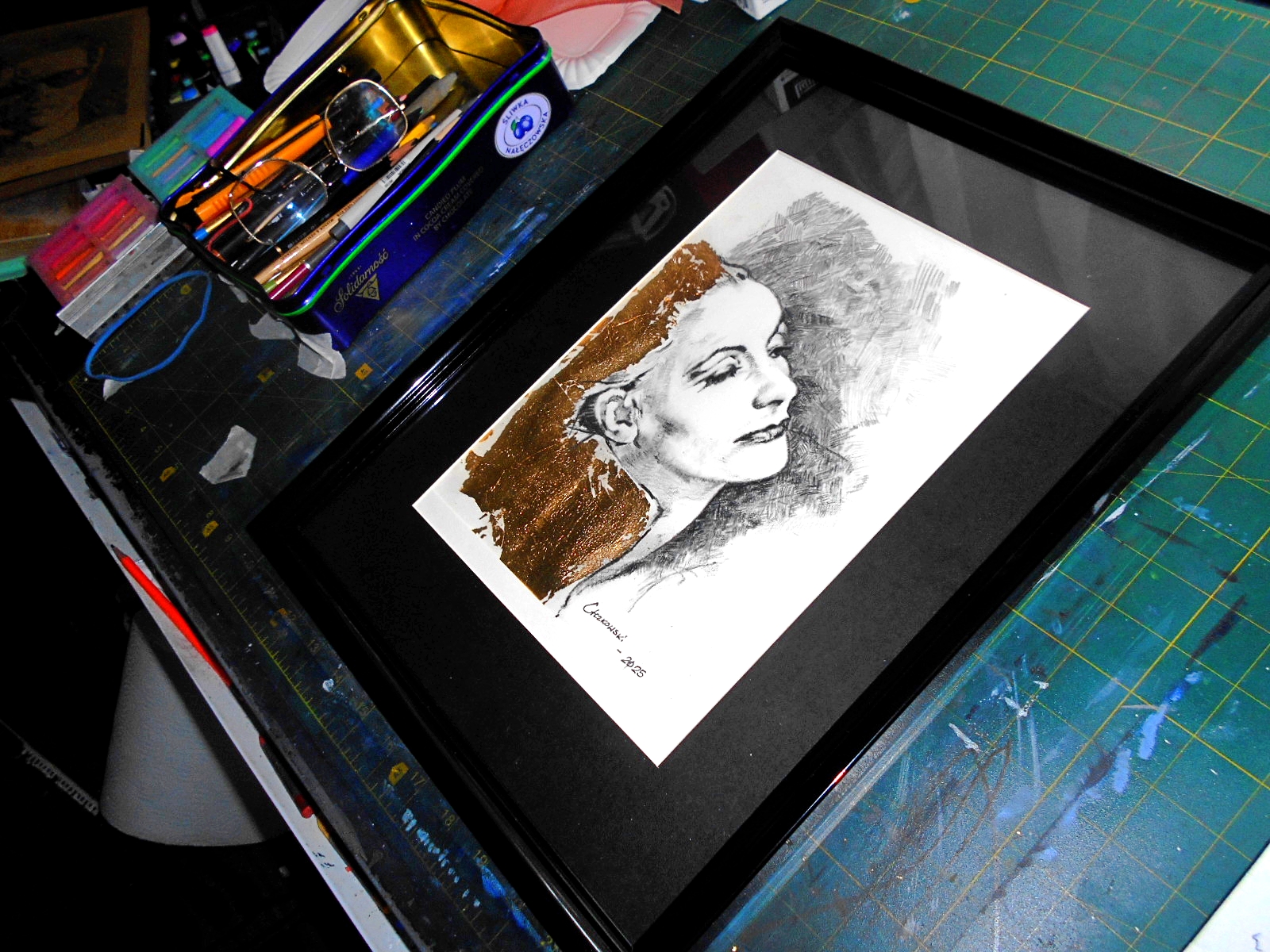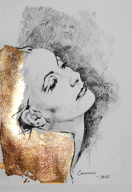 Ten obraz to prawdziwa eksplozja emocji. Na pierwszym planie widać profil kobiety, narysowany delikatnymi, lecz pewnymi liniami. Jej twarz uniesiona jest ku górze, z wyrazem kontemplacji lub lekkiego zachwytu. Można powiedzieć, że patrzy z zamyśleniem, może podziwia coś niezwykłego. Tło zrobione jest z chaotycznych, kreskowanych linii, które dodają dynamiki i odrobinę "messy" atmosfery. Złote liście wkomponowane w dolny róg obrazu nadają mu luksusowy charakter, przyciągają wzrok i realizują grę światła, niemalże jakby chciały powiedzieć "Hej, spójrz tutaj!". Ta niesamowita kombinacja technik rysunku i złotych detali tworzy unikalne połączenie sztuki klasycznej i nowoczesnej. Patrząc na ten obraz, można poczuć spokój, ale i lekką nostalgię. Artysta doskonale uchwycił kontrast między prostotą rysunku a bogactwem złota, co może wywoływać w odbiorcy uczucie równoczesnego harmonii i napięcia. Czy to nie jest wspaniałe, jak różnorodność może ze sobą współgrać? Niby wszystko jest takie proste, ale za każdym razem, gdy spojrzymy, odkrywamy coś nowego. Jak dla mnie, to trochę jak patrzenie na niebo pełne gwiazd. I takie jedno zdanie można napisać jak dziecko: pani wygląda jak złota księżniczka. To połączenie tradycji i nowoczesności, które zachęca do refleksji nad tym, jak różne techniki mogą razem współgrać w jednym dziele. Rysunek klasyczny portret w różnych ujęciach aktorki Grety Garbo. Wykonany przez artystę ołówkami i węglem w kredce . Artysta dodaje złote płatki szlagmetalu dodają atrakcyjności monochromatycznej pracy i wpisuje się do stylu glamur. Może być doskonałym prezentem. Jej miejsce to salon , sypialnia, gabinet. Praca jest oprawiona w delikatną ramkę z passe-partout na którą można nałożyć bardziej strojne obramowanie wg własnego gustu i uznania. Greta Garbo, KNO (wym. [ˈɡrêːta ˈɡǎrːbʊ], właśc. Greta Lovisa Gustafsson; ur. 18 września 1905 w Sztokholmie, zm. 15 kwietnia 1990 w Nowym Jorku) – szwedzko-amerykańska aktorka filmowa i teatralna. Uznawana za jedną z największych i najwybitniejszych gwiazd filmowych w historii kinematografii, a także jedną z legend „Złotej Ery Hollywood” i ikonę popkultury. Symbol seksu lat 20. i 30. XX wieku.