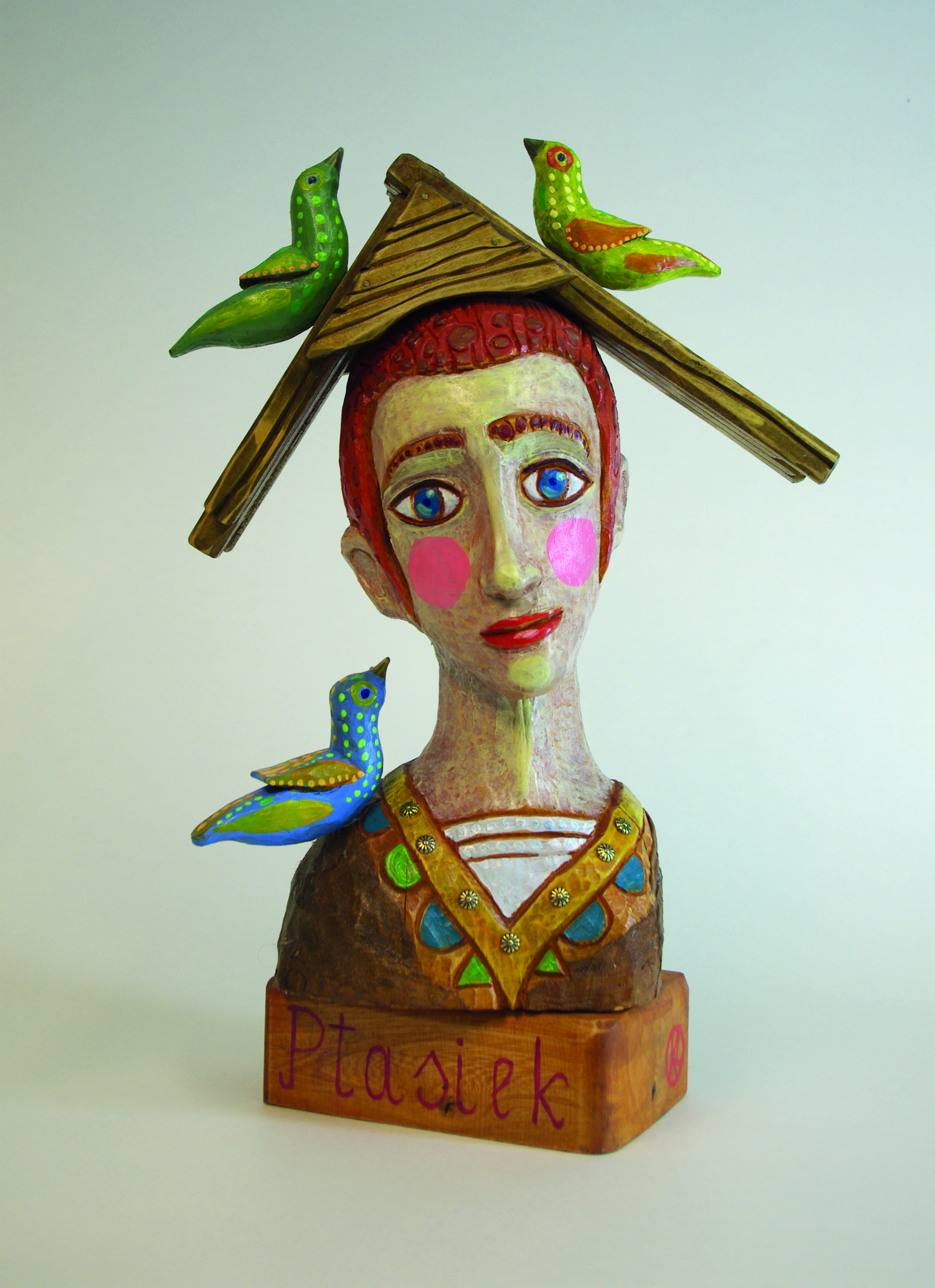 Rzeźbę o intrygującej formie, pełną kolorów i symboli. W centrum widzimy twarz postaci z wyrazistymi różowymi policzkami i błyszczącymi niebieskimi oczami. Na głowie tej figury spoczywa drewniany daszek, podobny do domku dla ptaków, na którym siedzą dwa kolorowe ptaszki. Zielony ptak patrzy w dal, a jego towarzysz w odcieniach niebieskiego wydaje się śpiewać. Te barwy – intensywne, żywe – przyciągają wzrok i dodają dziełu dynamiki i radości. Atmosfera jest pogodna, z delikatnym posmakiem surrealizmu. Wydaje się emanować spokojem i beztroską, jakby zapraszała do dziecięcej krainy wyobraźni. Może to być dzieło kogoś z talentem do magicznego realizmu, kto umie bawić się formą i znaczeniem. Takie "touch of whimsy", które sprawia, że człowiek się uśmiecha. Rzeźba wykonana jest w technice pracy w drewnie, z wyraźnie zauważalnymi śladami dłuta. Każdy element można interpretować na nowo, dostrzegając w nim inne znaczenia. A może to po prostu oda do wolności i radości życia?