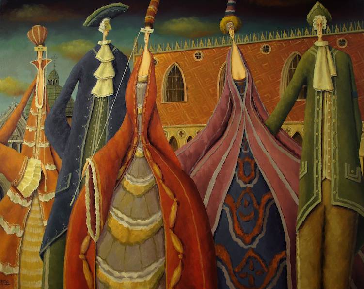 Widać orszak smukłych figur w historycznych kostiumach, ustawionych wachlarzowo przed ceglanym pałacem z ostrołukami. Paleta przygaszona, dużo rdzy i oranżu oraz miodu, przeciętych granatem i oliwkową zielenią, tworzy gęsty dywan koloru. Kształty balonowe, szyje nieprawdopodbnie długie, kontury miękkie, jakby rozmyte przez teatr światła. Te postacie mają bardzo długie sukienki i wyglądają jak wieże. Czuć karnawał, ale i spokój po nim, takie troche po, no i co. Pociagnięcia pędzla zostawiają fakturę, glazury tłumią blask, a ornament tkanin falą prowadzi wzrok. Styl manieryzujący z nutą surrealizmu, perspektywe artysta lekko krzywi, budując scenę jak teatr. Budzi to we mnie melancholię, ale też figlarną ciekawość, bo oni są tajemniczo eleganccy. Ich milczenie ma urok, odd.