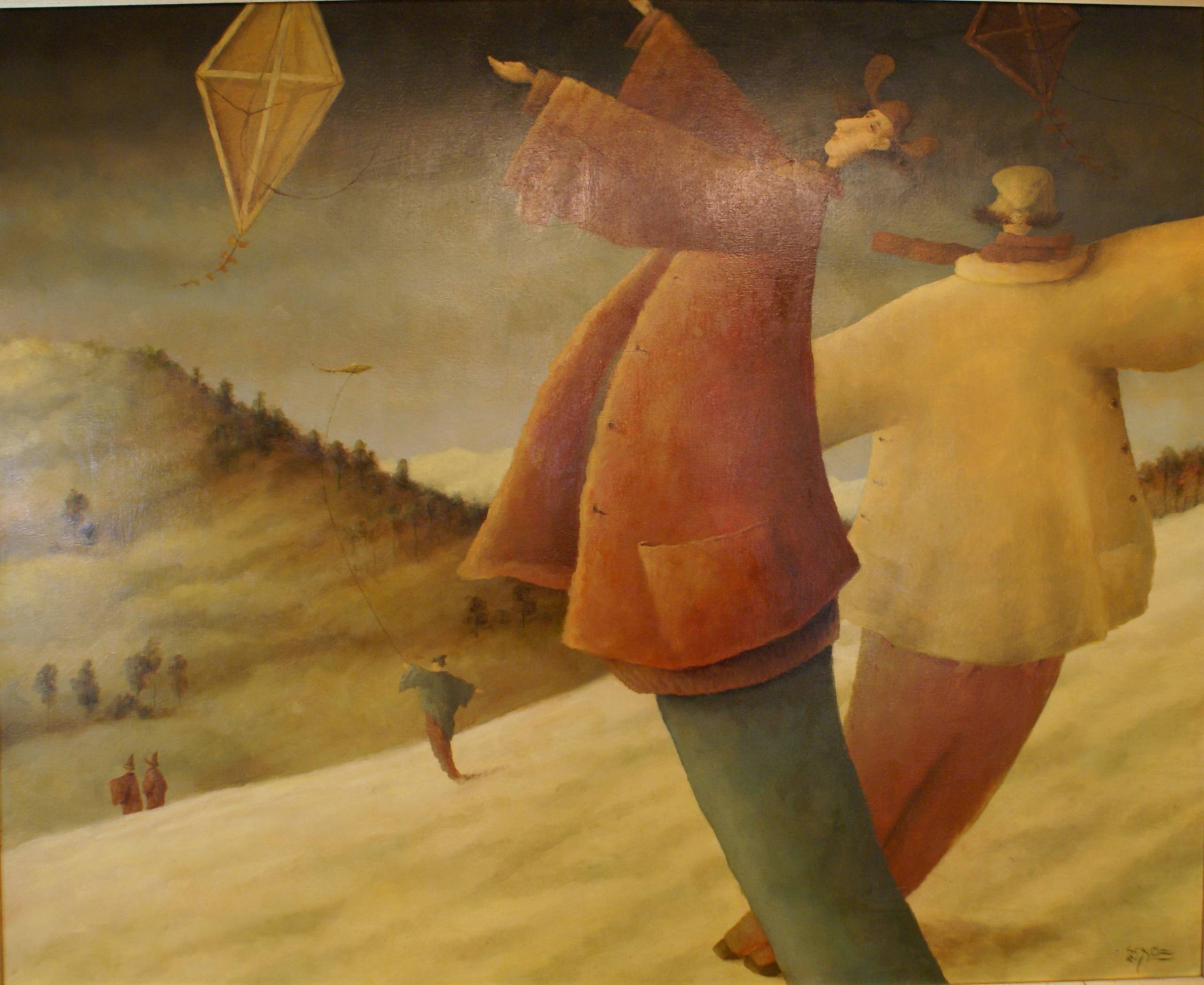 Obraz tonie w miękkiej mgiełce ochry i ugru, na ukośnym stoku dwie wydłużone postacie w wielkich płaszczach. Rozkładają ręce i puszczają romboidalne latawce, niebo gładkie jak welur, lekko przydymione. Kompozycję prowadzi diagonalna linia zbocza oraz rytm maleńkch postaci w tle. Widać szerokie pociągnięcia, cienkie laserunki i miękkie sfumato, faktura bywa chropawa i trochę nierówna, i dobrze. Atmosfera półsnu i ciepłego żartu, taka odrobinkę weightless i na luzie. Latawce lecą wysoko i ja też chcę tak biegać. To realizm poetycki z nutą baśni, proporcje zniekształcone, i to działa. Czuję spokój i ukłucie tęsknoty, jakby wiatr mówił wracaj do dziecka, choć czapkę zaraz zwieje.