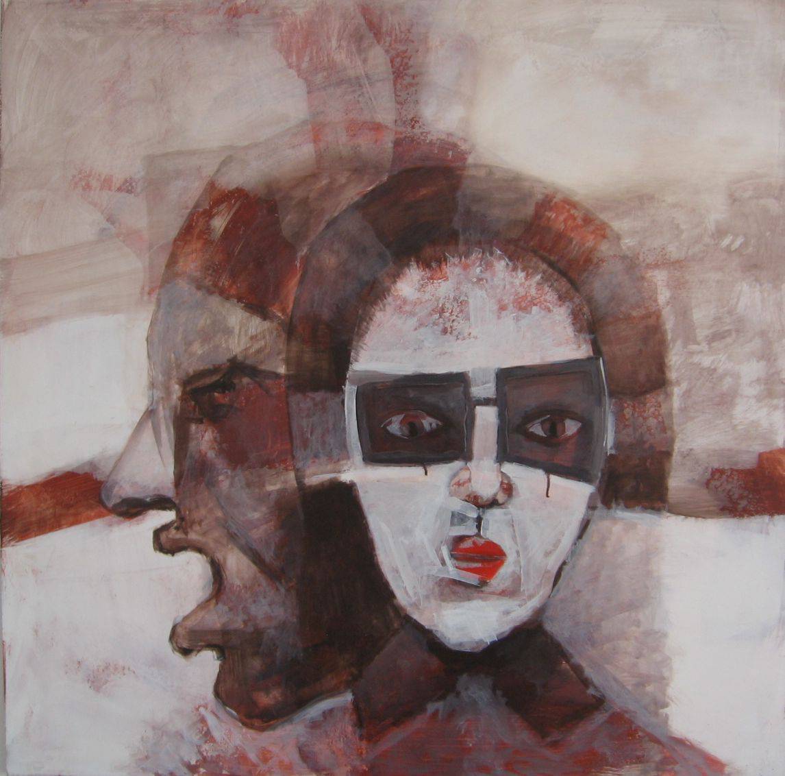 Obraz przedstawia dwie postaci, z których jedna ma wyraziste, abstrakcyjne rysy twarzy, przypominające maskę z czarnymi oczami i czerwonymi ustami. Druga, z boku, zdaje się krzyczeć, co dodaje dramatyzmu całej kompozycji. Dominują tu odcienie brązu i czerwieni, kontrastujące z zimnymi tonami bieli, co tworzy dynamiczne napięcie między postaciami. Farba jest nałożona grubymi pociągnięciami pędzla, co nadaje obrazowi teksturę i surowość. Kiedy patrzę na ten obraz, czuję jakąś niepokojącą ciszę, która zdaje się zwiastować burzę. "Why is the face so funny, mom?" - mogłoby zapytać dziecko. Pełen emocji, obraz zdaje się pytać o naturę ludzkich emocji, te ukryte i te wylewające się na zewnątrz. Artysta zastosował technikę mieszania barw i geometrycznych kształtów, co kieruje odbiorcę ku refleksji nad własnymi przeżyciami. Wszystko to sprawia, że jest to prawdziwe "eye-catcher", nie sposób od niego oderwać wzroku.
