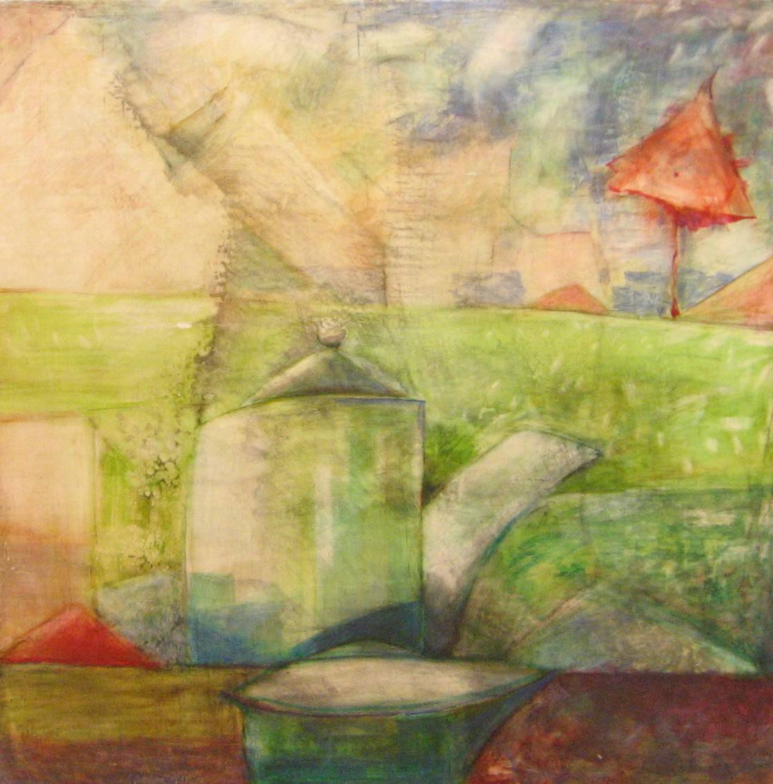 Obraz przyciąga wzrok swoją paletą stonowanych kolorów, dominują tu zielone, pomarańczowe i niebieskie odcienie, które tworzą harmonijną całość. Kształty są geometryczne, ale nieco rozmyte, co nadaje całości łagodny, oniryczny charakter. Centralnym punktem jest zarys dzbanka, który zdaje się unosić w krajobrazie pełnym abstrakcyjnych form. Nastrój obrazu można opisać jako spokojny, z lekką nutą tajemniczości. Artysta wykorzystał technikę mieszania barw akwarelowych, dzięki czemu kompozycja jest pełna subtelnych przejść tonalnych. Ta technika dodaje obrazowi lekkiej niepewności, jakby granice rzeczywistości były tuż za rogiem. Patrząc na ten obraz, można poczuć pewną melancholię, ale też nadzieję. Wydaje się, że obraz opowiada historię o poszukiwaniu harmonii w chaosie. Może przypominać puzzle, które próbujemy poskładać w całość. Styl artystyczny jest bliski impresjonizmowi, z nutą abstrakcji, co sprawia, że widz staje przed wyzwaniem interpretacji każdego detalu. "Wow, to wygląda jak magiczna kraina!" powiedziałoby dziecko widząc to dzieło. The painting evokes a dreamlike quality. Czuć tu emocjonalną głębię, jak gdyby obraz miał duszę, która pragnie się z nami podzielić swoją introspekcją. Patrząc na niego, można zadać sobie pytanie, co kryje się za tymi kształtami, jakie tajemnice skrywają się w miękkiej zieleni i skąpanej w słońcu czerwieni. Ktoś mógłby powiedzieć, że obraz zaprasza do medytacji, inny, że do odkrywania nieznanego.