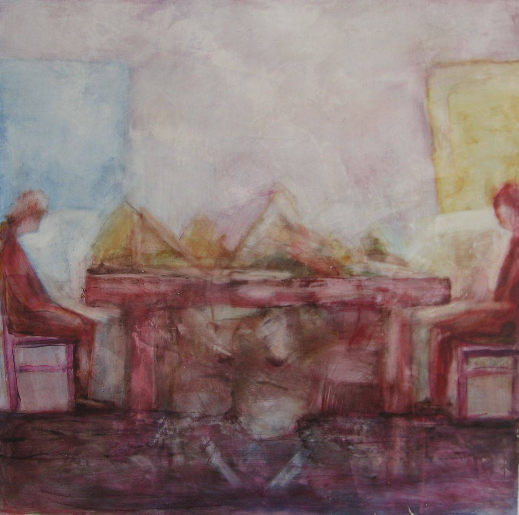Obraz przedstawia nieco zamazaną scenę, która na pierwszy rzut oka wydaje się tajemnicza i nieuchwytna. Dominują tu delikatne odcienie pastelowe — róż, błękit, beże i subtelnie przechodzące jedna w drugą plamy kolorów. Po bokach, na krzesłach siedzą postaci, skierowane w stronę siebie, jakby prowadziły jakąś niemą rozmowę. Przy stole, który dzieli obraz na pół, wokół którego toczy się cała akcja. Mglisty nastrój nadaje całości dreamlike quality, jakbyśmy oglądali sen przez zasłonę mgły. Styl artystyczny jest bardzo impresjonistyczny; artysta wykorzystuje delikatne pociągnięcia pędzla i słabą linię, by stworzyć poczucie ulotności chwili. Kompozycja wprowadza widza w świat ciszy i spokoju. Można niemal poczuć delikatny powiew wiatru, który porusza zasłony w tle. Obraz emanuje spokojem, ale też pewnym napięciem. Może budzić w odbiorcy refleksję nad relacjami międzyludzkimi, przepływem czasu i znaczeniem bliskości. Ten obraz czuję, że mówi coś o życiu, o chwilach, które są kruche i pełne ukrytych znaczeń. Dla dziecka mógłby to być "obrazek, gdzie ludzie się przyjaźnią przy stole". Magiczna atmosfera przyciąga uwagę i zachęca do zanurzenia się głębiej w przedstawioną historię.