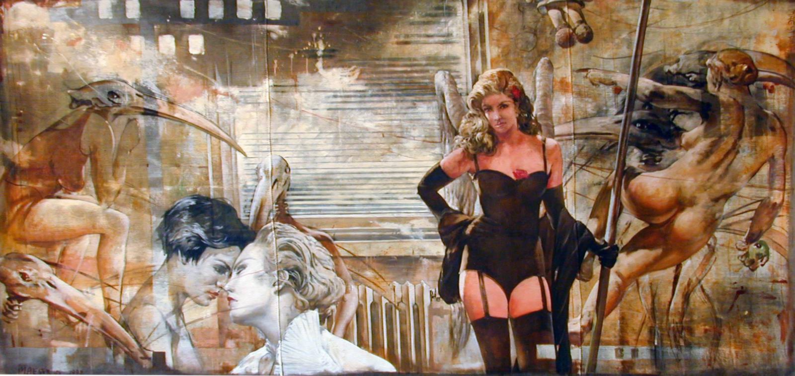 Obraz emanuje surrealizmem, łącząc różnorodne elementy w jednej kompozycji. Dominują tu brązy i beże, które tworzą przytłumiony i nostalgiczny klimat. Postać kobiety w centrum ubrana w ciemny strój przypomina scenę z dawnego filmu noir. Jej szata kontrastuje z delikatniejszym tłem, gdzie zauważalne są mniej wyraziste, jakby rozmyte detale. Towarzyszą jej figury mężczyzn z ptasimi głowami, które dodają tajemniczości i nieco niepokojącego nastroju. Artysta zastosował technikę kolażu z elementami malarskimi - widać tu ślady pędzla, ale też jakby nakładane na siebie warstwy obrazów. Mieszanina realizmu z fantastyką przywodzi na myśl dzieła z pogranicza snu i jawy, co potęguje wrażenie odrealnienia. Odbiorca może poczuć się zdezorientowany, a jednocześnie zafascynowany tą dziwną krainą ze świata wyobraźni. Ja bym powiedział, że to wygląda jak z książki z bajkami dla dorosłych! Obraz pobudza wyobraźnię, zmuszając do poszukiwania ukrytych znaczeń. Widz może się zastanawiać: co autor miał na myśli, a może po prostu czerpał z fragmentów "the chaos" snów?