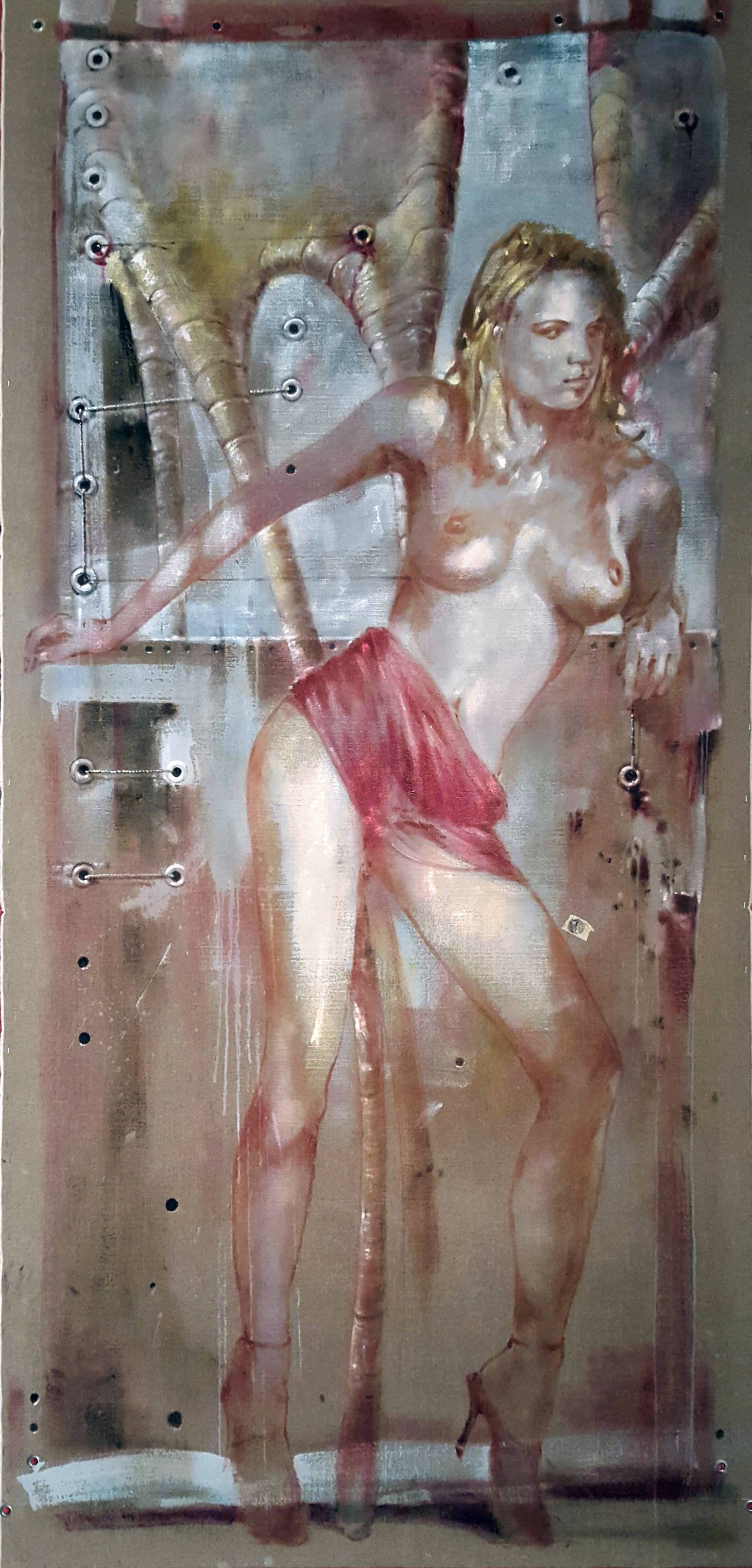 Obraz emanuje niezwykłą mieszanką nastrojowego ciepła i delikatności. Dominujące są tu łagodne, pastelowe kolory, przeważa beż z odcieniem różu i złota. Postać kobiety, lekko pochylona, wpisuje się w typ kompozycji dynamicznej, zmysłowej i tajemniczej. Sprawia wrażenie ulotnej i nieuchwytnej. Tło stanowi abstrakcyjne zestawienie kształtów i detali, przypominających industrialne elementy, co dodaje nowoczesności. Styl dzieła wskazuje na użycie technik mieszanych. Widoczne pociągnięcia pędzla sugerują impresjonistyczne wpływy, które przełamują bardziej realistyczne przedstawienie postaci. Artysta bawi się światłocieniem, tworząc subtelne przejście między jasnością a cieniem. Wygląda to magic. Patrząc na obraz, można poczuć ciepło i delikatność, jakby kobieta stanowiła uosobienie niewinności i siły. Jednocześnie obecność mechanicznych wzorów w tle wprowadza niepokój, może nawet futurystyczną atmosferę. Dzieciak mógłby rzec: „Pani jak z baśni stoi”. Dzieło angażuje odbiorcę, prowokując do refleksji nad granicą między ludzkością a technologią. Coś w tym jest. Przyciąga wzrok i skłania do głębszej analizy.