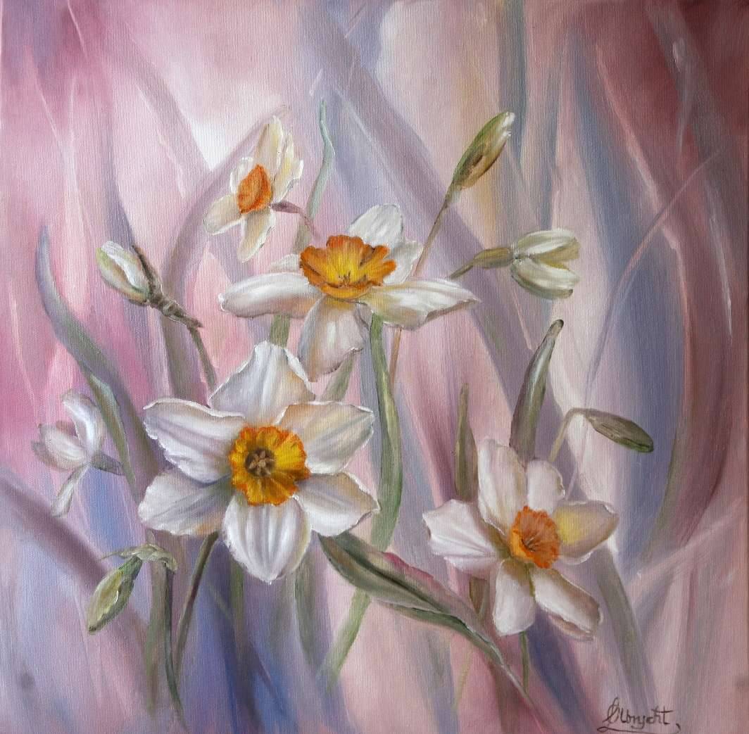 Patrząc na ten obraz, od razu wpadamy w ciepłą i sielankową atmosferę. Na pierwszym planie widzimy delikatne, białe kwiaty - prawdopodobnie narcyzy - z jaskrawo pomarańczowymi środkami, które zdają się niemal błyszczeć na tle łagodnych różów i szarości. Te subtelne kolory sprawiają, że całość wygląda jak scena z bajki. Kompozycja jest harmonijna, nieco nostalgiczna, a same kwiaty układają się jakby tańczyły na wietrze. Ojej! Chciałbym je powąchać. Obraz emanuje spokojem i pogodą ducha, jak poranek w wiosennym ogrodzie. Artysta użył miękkich pociągnięć pędzla, a technika przypomina malarstwo impresjonistyczne z lekką nutą magii. Ten styl dodaje obrazu dreamy quality, wciągając widza w świat lekkości i eteryczności. Obraz może wywoływać uczucia relaksu i ciepła, pozwalając zapomnieć o codziennych troskach. Patrząc na niego, czuję jakby czas się zatrzymał, a w powietrzu unosił się zapach świeżo rozkwitłych kwiatów. Każdy, kto spojrzy na ten obraz, może odkryć coś innego, coś magicznego. Jest w nim coś niezwykle magicznego, co sprawia, że chce się na niego patrzeć bez końca.