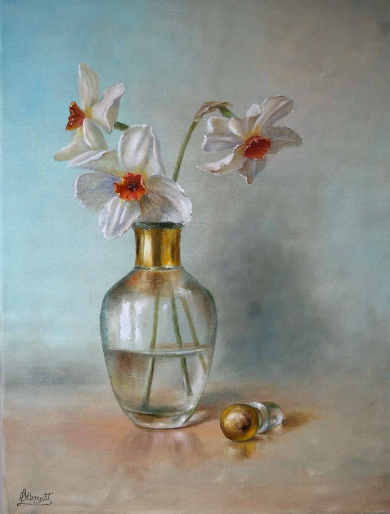 Na tym obrazie mamy delikatny bukiet narcyzów w szklanym wazonie. Kolory są stonowane, dominują pastelowe odcienie błękitu i zieleni, które tworzą spokojne tło. Kwiaty wyróżniają się bielą z subtelnymi czerwonymi akcentami w środku, przyciągając wzrok odbiorcy. Kompozycja jest prosta, ale właśnie w tej prostocie drzemie siła. Na obrazie panuje nostalgia, jakby zatrzymany moment w czasie. Styl malarski artysty przywodzi na myśl realizm, z cierpliwie oddanymi szczegółami szkła i płatków kwiatów. Kiedy na to patrzę, czuję spokój. To jak cichy poranek, kiedy jeszcze wszyscy śpią. Technika światłocienia dodaje dziełu głębi, sprawiając, że wazon wygląda trójwymiarowo. Wygląda jakby zaraz miał coś nam powiedzieć. Dzieciak mógłby powiedzieć: "To wazon z kwiatkami dla mamy." Tak prosto i szczerze. Obraz emanuje delikatnością, subtelnością. Działa na emocje, jest jak whisper z przeszłości. Czujemy ukojenie, ale także pewnego rodzaju tęsknotę za czymś nieuchwytnym. To nostalgia ubrana w farby i pędzle.