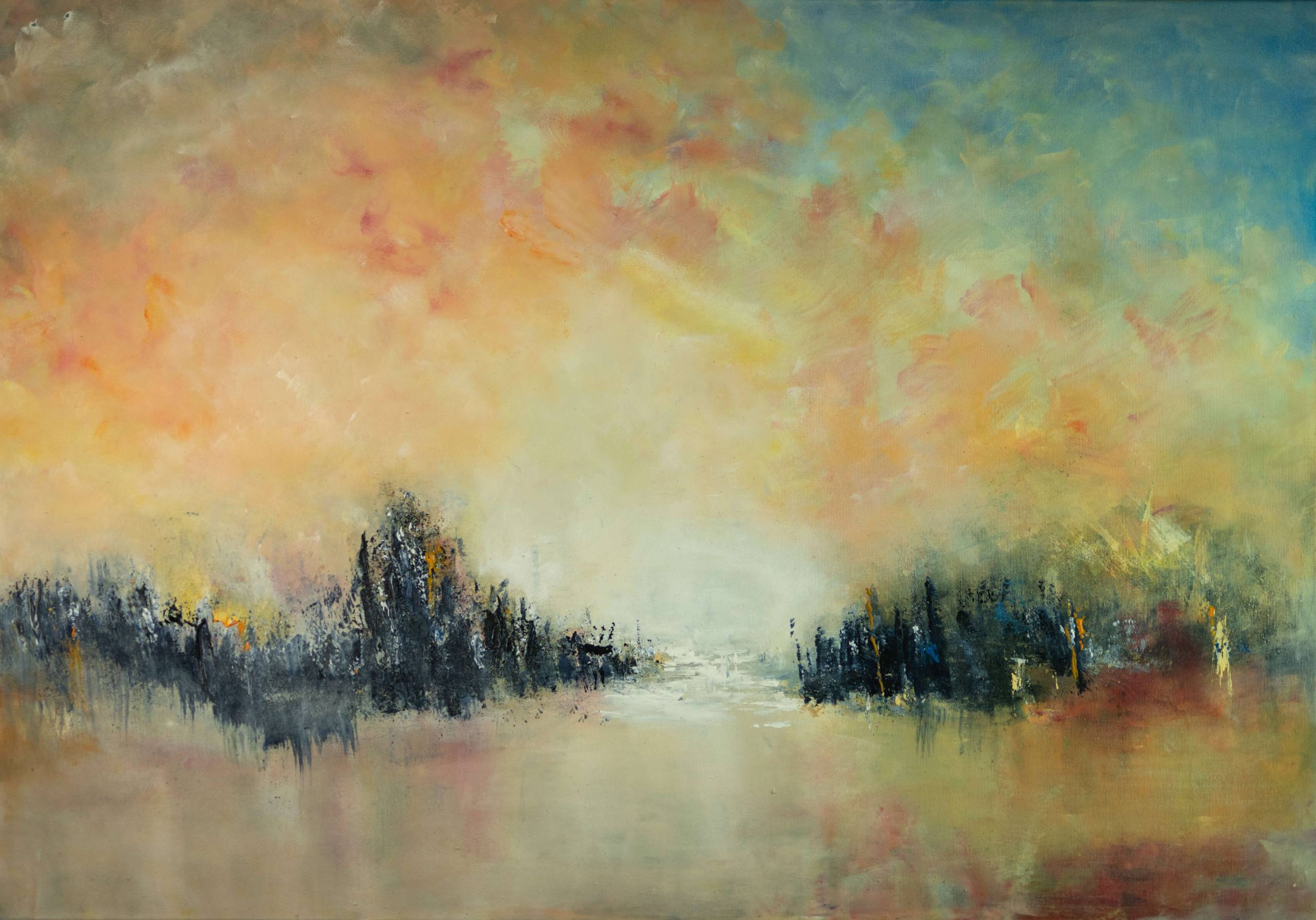 Malowanie : akryl, gesso na płótnie. Barwy zachodzącego słońca, delikatne przenikanie się barw zamykającego dnia. Duży obraz akrylowy gotowy do powieszenia pięknie ozdobi salon Twojego domu. Obraz sygnowany na odwrocie.