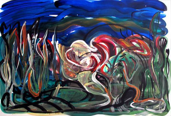 Obraz emanuje intensywnymi barwami i dynamiczną kompozycją, gdzie dominują niebieskie, czerwone i zielone odcienie. Te żywe kolory splatają się w płynne, faliste kształty, które przypominają wirującą energię czy ruch wody. Artysta zastosował tu technikę przypominającą ekspresjonizm, gdzie śmiały pędzel, swobodny styl i brak ostrych konturów dominują w całej pracy. Nastrój obrazu jest niemal elektryzujący. Gdy na niego patrzę, czuję się jakbym obserwował naturę tuż przed burzą. To pełne życia i emocji dzieło może wywoływać w odbiorcy uczucie napięcia lub zachwytu. Dwubiegunowość między spokojem a chaosem fascynuje. Wprowadza też nutę tajemnicy, co sprawia, że każdy widzi w nim coś innego. Jakby artysta powiedział: "Feel the storm". A ktoś mógłby powiedzieć: "Patrz, jak się kolorowo namieszało!" To coś więcej niż tylko obraz. To emocjonalna podróż dla tych, którzy się jej podejmą.