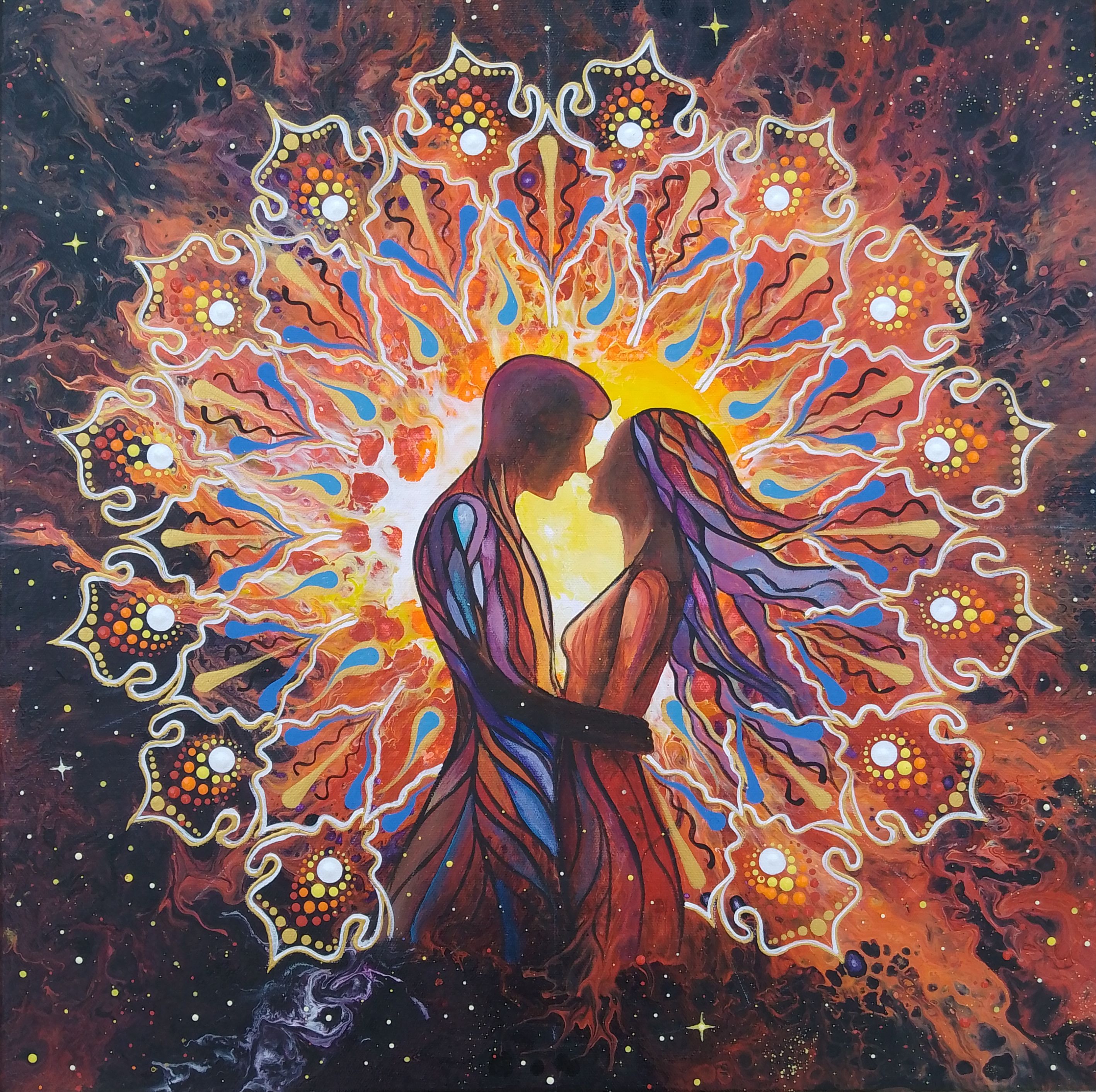 Na obrazie widzimy parę w namiętnym uścisku, otoczoną wybuchową paletą barw. Dominują ciepłe odcienie: pomarańcz, żółcienie i czerwienie, które mieszają się z chłodnymi niebieskimi i fioletowymi akcentami. To wszystko tworzy niesamowity, kalejdoskopowy wzór wokół zakochanych, przypominający mandalę. We wnętrzu tej sceny czuć niewiarygodne napięcie i tajemniczość. Atmosfera jest prawdziwie magiczna, jakby para unosiła się w kosmosie pełnym gwiazd i kolorów. Artysta zastosował technikę mieszanych farb, kreując dynamiczne przejścia między barwami, co przypomina swirling emotions zaburzające granicę między rzeczywistością a wizją. Podejście do form i linii jest płynne, co dodaje ekspresji całemu dziełu. Dla odbiorcy moment ten może być odczytywany jako symbol uniwersalnej miłości, transcendencji czasu i przestrzeni. To jest jakby dwoje ludzi stało się jednym, dusza z duszą, kolor z kolorem. Wyczuwalny jest spokój, ale i intensywność – taki balans na krawędzi. Trzeba przyznać, że wizualnie obraz wzbudza zachwyt i refleksję. Myśli mi uciekają do tego, jak wiele emocji potrafią zatrzymać w sobie takie dzieła. Jest w tym coś ponadczasowego. Patrząc na obraz, odczuwam ciepło, jakby coś w sercu mnie rozpalało. Moje wewnętrzne dziecko mówi tylko: „O, jacy piękni!”