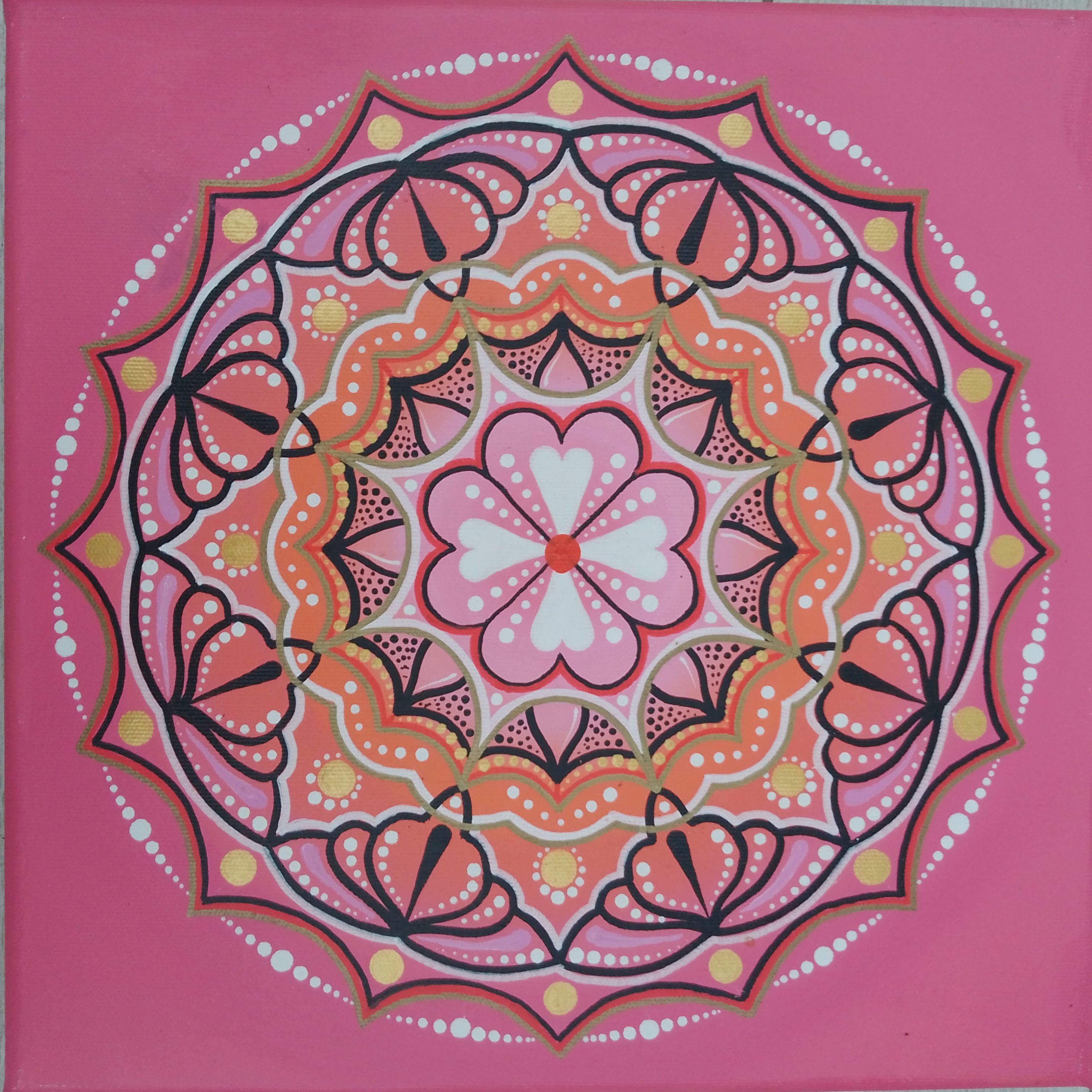 Mandala malowana w intencji: przyjęcie siebie z miłością, akceptacja siebie i zaufanie. Kolory czakry podstawy stabilizują świat fizyczny. Ten obraz to prawdziwa fiesta kolorów i kształtów. Na pierwszy rzut oka przyciąga spojrzenie swoim różowym tłem, na którym centralnie rozkwita mandala. Dominują różne odcienie różu, pomarańczy i bieli, precyzyjnie połączone w symetryczne wzory. Gdyż te kolory wibrują na poziomie czakry pierwszej i drugiej odpowiadają za mocne zdrowie fizyczne, rozwój twórczości i energii. Kręgi mandali zdobią czarne linie i białe kropki, dodające jej dynamiki, głębi i równowagi całej kompozycji . To jakby wir kolorów i form, które tworzą harmonijną całość. Atmosfera, jaką emanuje ten obraz, jest pełna spokoju i harmonii. A może to taki „happy place”? Rodzaj takiego, gdzie można zanurzyć się w medytacji. Patrząc na ten obraz, można poczuć wewnętrzny spokój, a jednocześnie energię. To takie "wow", które sprawia, że myśli biegną w stronę radosnych wspomnień. Może dla niektórych wygląda jak kalejdoskop emocji, który nieustannie się zmieniają, tak jak motyle są symbolem transformacji i wiecznego ruchu. Artysta umiejętnie bawi się kontrastami, które przyciągają wzrok i zachęcają do dłuższego kontemplowania dzieła. Po prostu incredible!