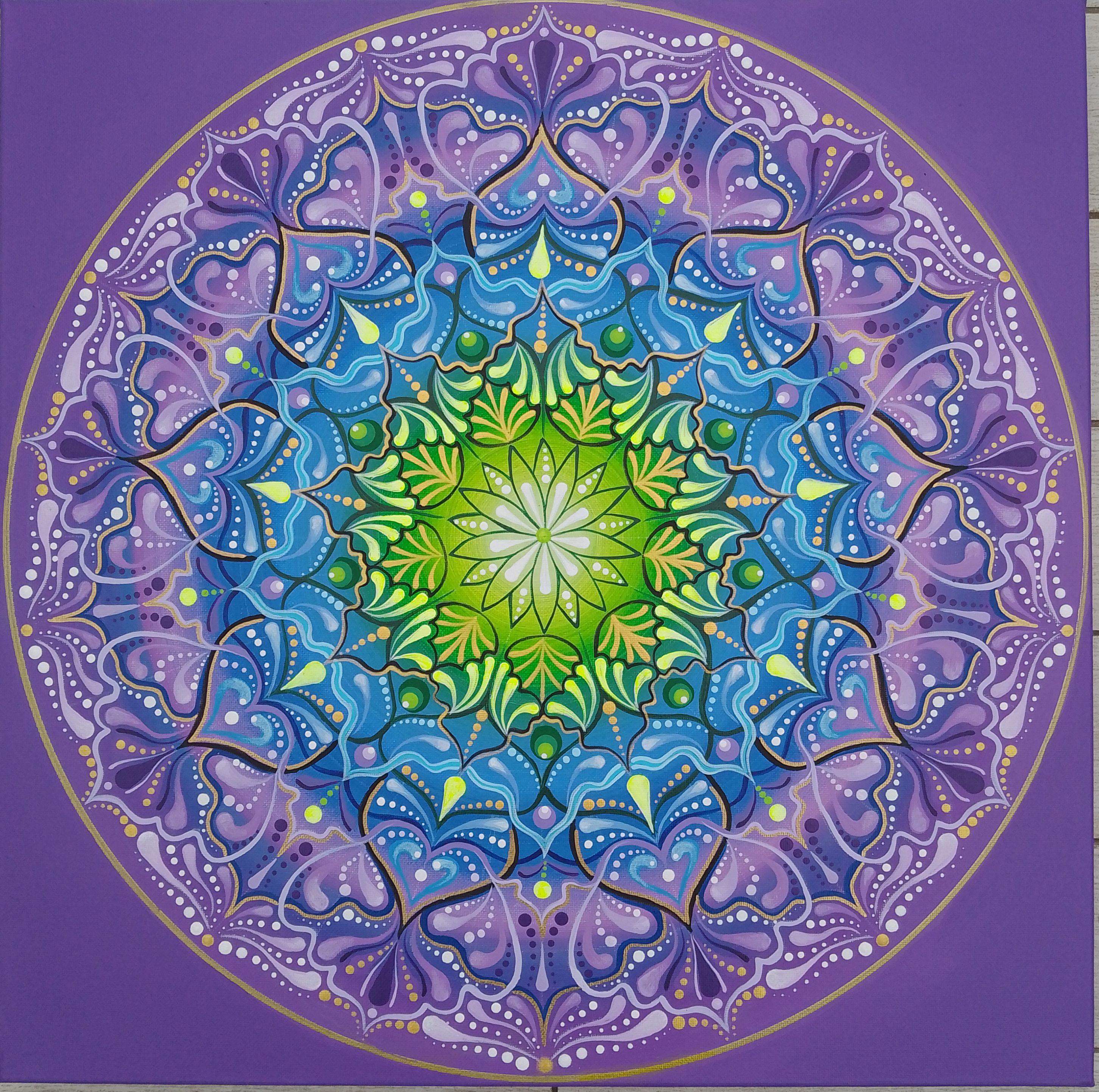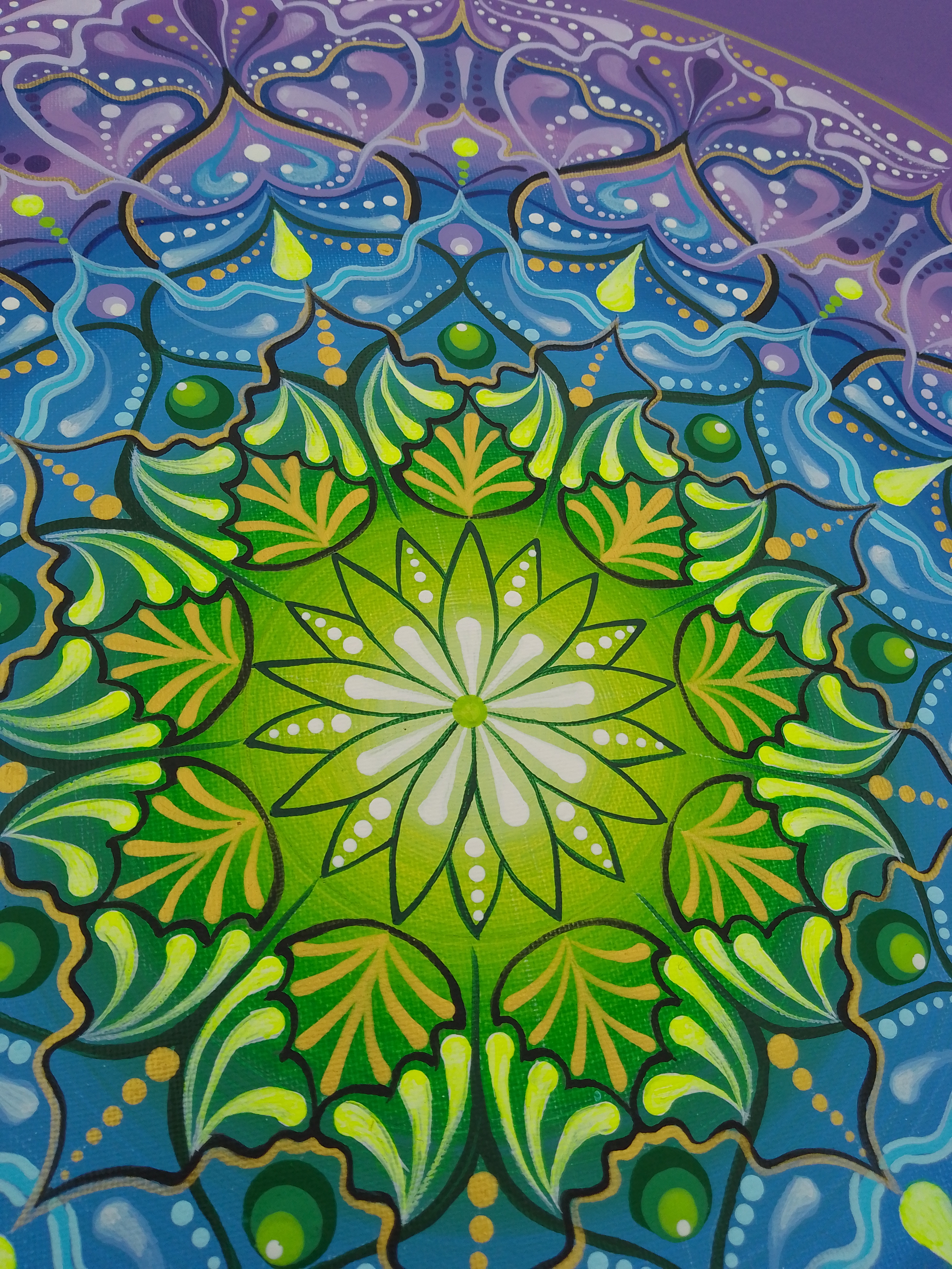 Na obrazie dominuje energetyczna mandala pełna kolorów: od soczystej zieleni po głęboki niebieski i pastelowe odcienie fioletu. Każdy detal jest jak miniaturowe dzieło sztuki, tworząc skomplikowane wzory, które prowadzą wzrok w kierunku centrum. Kształty przypominają kwiaty, liście, a może fantazyjne esy-floresy. Atmosfera jest spokojna, niemalże medytacyjna. Kiedy na to patrzę, czuję, jakby czas się zatrzymał. Styl artystyczny przypomina mandalę tworzoną z precyzją i cierpliwością. Czy to nie wspaniałe jak kolory mogą wpływać na nasze emocje? Twórca wykorzystał kontrasty i harmonie barw, by stworzyć fascynującą grę świateł. Obraz może wywoływać w odbiorcy poczucie harmonii i wewnętrznego spokoju. Patrząc na to dzieło, można poczuć, jak artysta stworzył coś magicznego. Wciąga mnie to, jakby każda barwa miała opowiadać swoją własną historię. Jest coś hipnotyzującego w tej kompozycji, coś, co zasługuje na uwagę i przypomina o pięknie otaczającego świata.