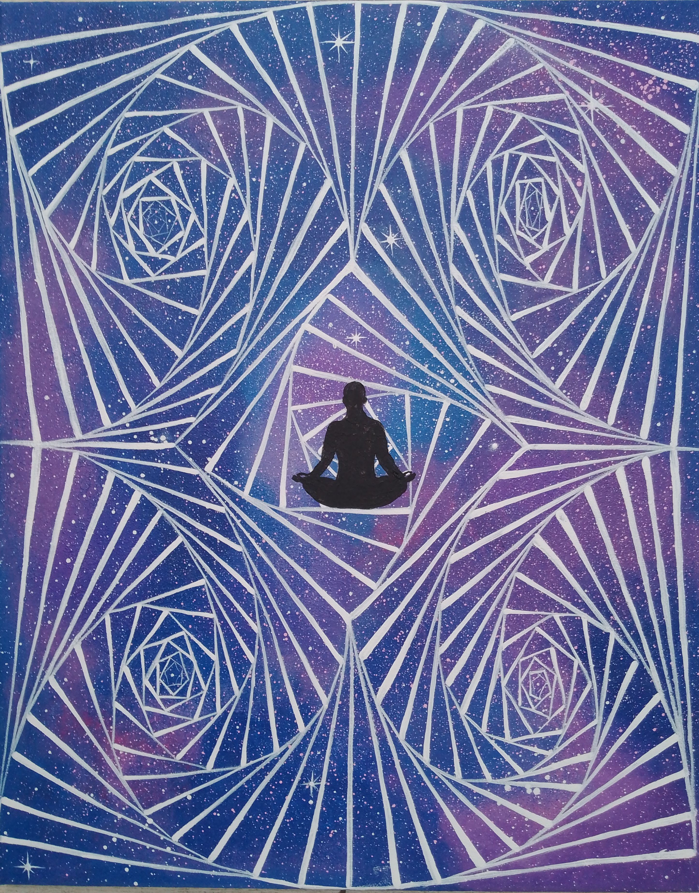 Obraz przykuwa uwagę spiralną kompozycją, w centrum której znajduje się sylwetka człowieka w pozycji medytacyjnej. Dominują odcienie błękitu i fioletu, które przechodzą w głęboką nocną przestrzeń, usianą gwiazdami. Całość wygląda jak zaproszenie do kosmicznej podróży. Atmosfera jest tajemnicza i uspokajająca, jakby czas zatrzymał się w nieskończoności. Artysta zastosował kontrastujące białe linie, tworzące geometryczne spirale, które wprowadzają dynamikę w tę medytacyjną scenę. Efekt przypomina nieco psychodeliczne wzory, co dodaje obrazowi surrealistycznego klimatu. Obraz skłania do refleksji nad nieograniczonością wszechświata i ludzkiej świadomości. Można poczuć się zagubionym, a jednocześnie w pełni obecnym "tu i teraz". Technika mieszania kolorów sprawia, że monochromatyczne tło żyje mleczną drogą gwiazd. Super cool efekt kosmiczny! Jak patrzę na tego medytującego człowieka, czuję, jakby chciał mnie zabrać w podróż do wnętrza siebie. Może to on jest centrum wszechświata? Kto wie! Kompozycja jest równocześnie chaotyczna i uporządkowana, co wciąga w jej wir emocji i myśli. Czy to jest jak podróż w kosmos ducha? Jak myślisz?