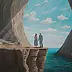 Obraz emanuje niezwykłą atmosferą spokoju i tajemniczości. Jasne niebo w odcieniach błękitu przetykanego białymi obłokami kontrastuje z ciemnymi, surowymi skałami. W centrum znajdują się postacie dwojga ludzi stojących na krawędzi klifu; trzymają się za ręce, spoglądając na horyzont. Jasne promienie słońca przepływają przez otwór w skale, dodając scenie dramatyzmu. Taki duży kamień wygląda jak gigantyczna brama do innego wymiaru. Obraz jest pełen symboliki – nieznane, dalekie przestrzenie pełne możliwości. Czujesz dreszczyk, patrząc na to. Artysta zastosował technikę malarstwa realistycznego z elementami impresjonizmu. Detale skał są precyzyjne, niemal namacalne. Kolory - świetnie dobrane, tworzą harmonijną kompozycję. Można poczuć bryzę znad morza. Użycie światła i cienia dodaje głębii. Patrzenie na obraz wywołuje refleksję. Dokąd prowadzi to przejście? Może to początek nowej podróży, nowego życia. A może symbolika miłości, która przenosi cię w nieznane? To jak "adventure awaits" – niepewność, ale i ekscytacja. Myślę sobie, że ten obraz mógłby wisieć w moim salonie. Coś w nim jest naprawdę hipnotyzującego.