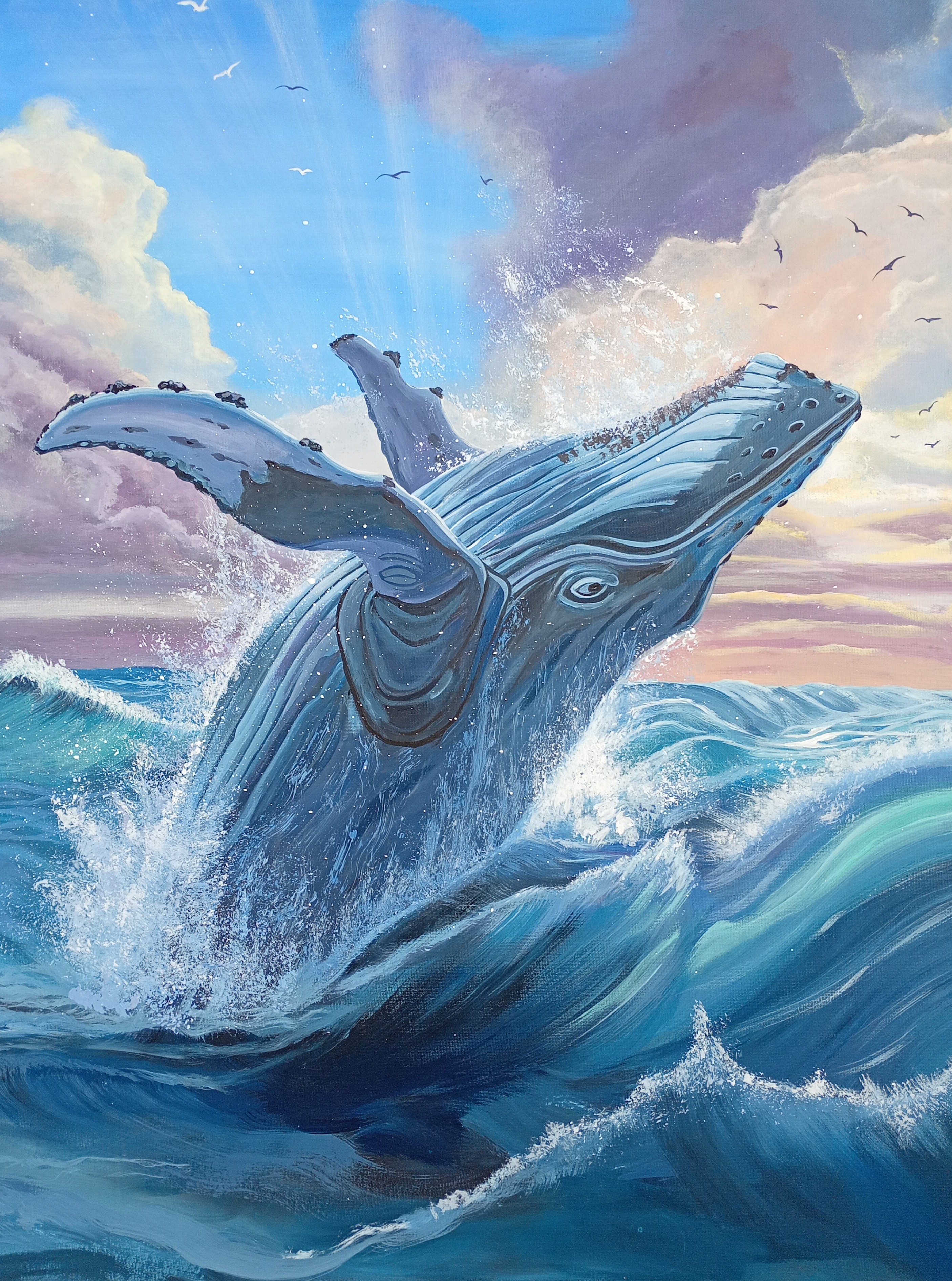 Na obrazie dominuje ogromny wieloryb wyskakujący z fal, ustawiony po skosie, jakby przecinał kadr na pół. Woda ma głębokie granaty i turkusy, a piana rozpryskuje się białymi kropkami, prawie jak śnieg. Niebo jest pastelowe, z różem i złotem przy horyzoncie, a wyżej przechodzi w chłodny błękit i fioletowe chmury. Ptaki krążą w niebie. To wygląda epic i trochę jak sen. Technika to akryl, z miękkimi przejściami i ostrymi smugami pędzla na falach. Czuję zachwyt i taki lekki dreszcz, bo ta bestia jest piękna i straszna jednocześnie. Wieloryb jest super duży i robi plusk. Obraz gada do mnie o wolności, ale też o tym, że ocean ma swój humor i nie pyta o zgodę.
