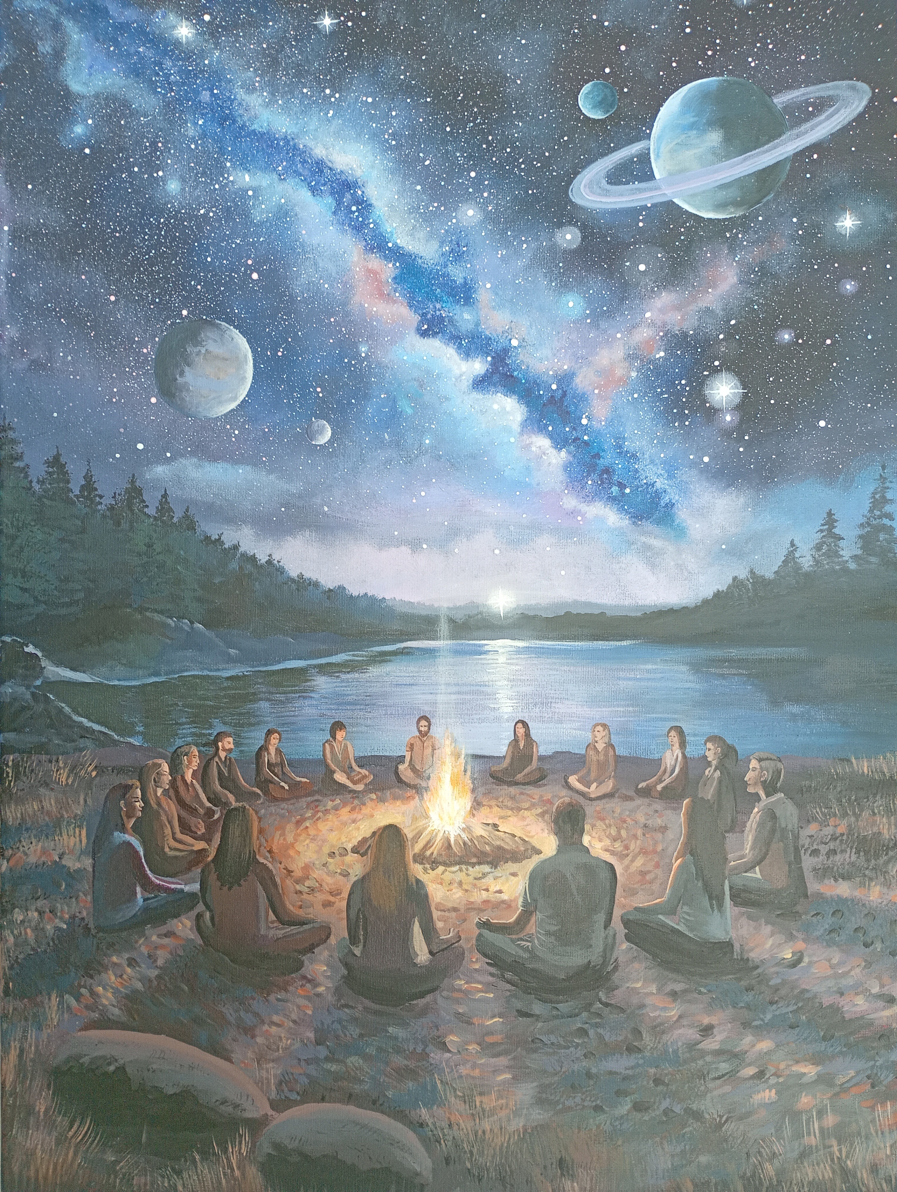 Grupa ludzi siedzi w kręgu wokół ogniska nad spokojnym jeziorem, zanurzona w ciszy i wspólnym skupieniu. Nad nimi rozpościera się rozgwieżdżone niebo z planetami i świetlistą galaktyką, tworząc atmosferę jedności z kosmosem i duchowej harmonii.