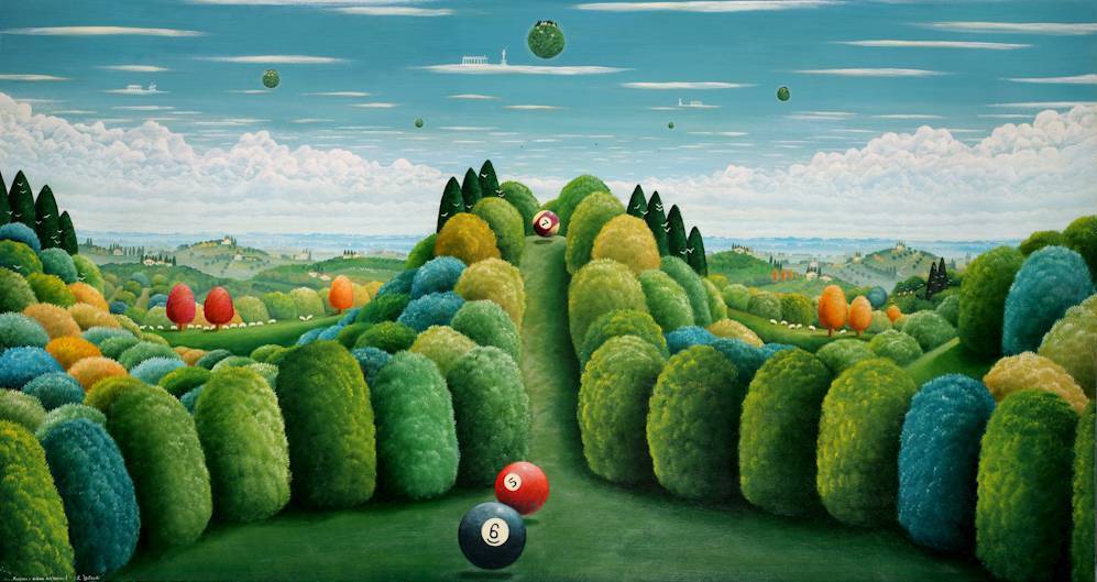 Obraz kipi kolorami, jakby ktoś rozlał farbę na płótno. Zielone i niebieskie formy krzewów tworzą falistą kompozycję, której rytm spokoju przerywają kontrastujące kulki bilardowe, leżące jakby przypadkiem na ścieżce. Niebo zasłane jest białymi chmurami, które wyglądają jak puszyste wata cukrowa. Krajobraz przypomina magiczną dolinę z bajki, taką, jaką mógłby narysować siedmioletni chłopiec. Klimat jest trochę nostaligiczny, jakby ta scena była wspomnieniem sprzed lat. Można poczuć delikatny powiew wiatru, który kołysze liście, niemal szepcząc: "come and play". Styl artysty jest surrealistyczny, a technika - ujmująca i lekka, jakby każda forma była starannie przemyślana. Te kolorowe kulki dodają dziełu elementu zaskoczenia i niepewności, która może budzić różne emocje. To trochę tak, jakby ktoś zaprosił nas do świata, gdzie wszystko jest możliwe, a natura staje się żywym placem zabaw. Sztuka ta zagadkowo wplata w nas szereg emocji; od radości po zadumę. To prawdziwy feast dla oczu i duszy.