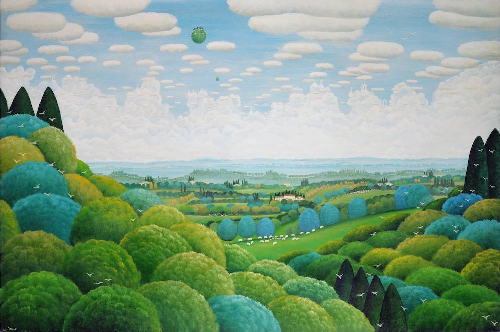 Obraz, który widzisz, to prawdziwa wizualna uczta. Dominują tutaj zielone odcienie drzew i wzgórz, które harmonijnie przeplatają się z turkusowymi akcentami, tworząc niemal idylliczny krajobraz. Mnóstwo tu puchatych chmur sunących leniwie po błękitnym niebie, przez co cała scena wygląda jak sceneria z bajki. Kompozycja jest dość zrównoważona; z jednej strony zielone wzgórza, z drugiej - daleki horyzont. Atmosfera obrazu jest przyjazna, niemal sielankowa. Artysta posłużył się techniką przypominającą aura pointillismu, gdzie poszczególne pociągnięcia pędzla składają się na większą całość - efekt jest magiczny. Może sobie wyobrazić, że dotykasz miękkiej trawy tych wzgórz. Wow, takie coś to prawdziwy land of dreams! Obraz ten wywołuje uczucie beztroski i spokoju, jakby zapraszał do odpoczynku i kontemplacji. Może ożywić wspomnienia letnich dni spędzonych na wsi, kiedy wiatr muskał twarz, a słońce ogrzewało plecy. Czyż nie jest to cudowne uciec tam myślami? Dziecko powiedziałoby: Tu mieszka wróżka! Pozwala na chwilę zapomnienia i relaksacji w codziennym pędzie. Połączenie prostoty i głębi tego dzieła po prostu zachwyca.