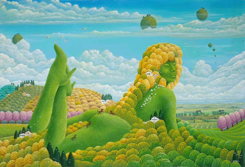 Na obrazie, bijący jasnymi barwami krajobraz łączy elementy natury z fantazją. Dominują odcienie zieleni i żółci przeplatane pastelowymi różami i błękitami. W centrum kompozycji wyrasta postać kobiety, z której włosów pełzają malutkie domki. Jej ciało jest jakby częścią plastycznej ziemi, z której zbudowano całe wzgórza. Artysta użył delikatnych pociągnięć pędzla, tworząc miękkie przejścia pomiędzy elementami, co potęguje magiczną atmosferę obrazu. Obraz emanuje spokojem i ciepłem, które mogą wprowadzać widza w stan błogiego relaksu. Lekko surrealistyczny styl przypomina sielską krainę z dziecięcych marzeń. Wyczuwalny jest tutaj wpływ stylu realizmu magicznego, gdzie rzeczywistość miesza się z elementami nadprzyrodzonymi. To trochę jakbym patrzył na "dzieciństwo natury", pełne niewinności i czystej radości. Wszystko w nim wydaje się możliwe. "To wygląda jak bajka!" - mogłoby zakrzyknąć dziecko. Patrząc na ten obraz, czuję się jakbym wkraczał do nieznanego świata, gdzie wszystko jest "possible" i przyjazne. Każdy element kompozycji zdaje się zapraszać do odkrycia własnej interpretacji, co czyni ten obraz niezwykle personalnym doświadczeniem dla każdego oglądającego.