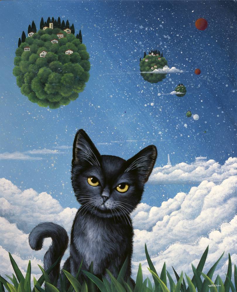Na obrazie widzimy zaskakujące połączenie realizmu i fantazji. W centrum uwagi znajduje się czarny kot o przenikliwych, żółtych oczach, który zdaje się przyglądać widzowi z pewnym zaciekawieniem. Tło to surrealistyczna sceneria – unoszące się w powietrzu zielone wyspy, pokryte malowniczymi, malutkimi domami. Nastrój tej pracy jest niemalże magiczny, przenosząc nas do świata pełnego tajemnic i cudów, jak z opowieści dla dzieci. Kolory są intensywne, niebo pełne gwiazd wokół kociego bohatera dodaje pracy nieco kosmicznego feelingu. Artysta zastosował tu różne techniki – precyzja w fur znaniu kota łączy się z bardziej swobodnymi pociągnięciami pędzla w tle. Pewne elementy przypominają malarstwo renesansowe, a jednocześnie wprowadzenie surrealistycznych detali sprawia, że dzieło jest świeże i niesztampowe. Wywołuje ono mieszane emocje – od spokoju, przez fascynację, po lekki niepokój. Taki obraz wywołuje również refleksję nad naszym miejscem we wszechświecie. Czyżby kot miał dostęp do tajemnic, których my nie znamy? A w ogródku mojej babci też jest kotek, tylko cały biały. Podziwiając tę pracę, czujemy się trochę jak dzieci, które odkrywają świat w sposób nieskrępowany. Artysta wspaniale bawi się tutaj wyobraźnią, tworząc dzieło, które jest jednocześnie urocze i intrygujące. Catchy, prawda?