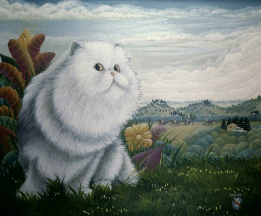Na obrazie widzimy puszystego, białego kota, który siedzi wśród soczystej zieleni. Jego futro jest tak obfite, że niemal przytłacza resztę elementów. W tle rozciąga się malowniczy krajobraz z delikatnymi wzgórzami i chmurami płynącymi po jasnoniebieskim niebie. Kolory obrazu są miękkie, pastelowe, co nadaje mu spokojną i sielankową atmosferę. Można poczuć się tu jak w bajce, gdzie czas płynie wolniej. Styl artystyczny przypomina realizm z odrobiną magii. Artysta dopracował każdy szczegół, sprawiając, że kot wygląda niemal jak żywy. Technika pędzla miękko oddaje teksturę futra, a kompozycja skupia wzrok na ciekawym spojrzeniu kota, które zdaje się wypatrywać czegoś poza ramy obrazu. Ten uroczy zwierzak mógłby być bohaterem dziecięcej opowieści – na pewno jest przyjacielem każdego, kto zajrzy mu w oczy. Dla mnie, patrzenie na ten obraz jest jak ciepłe przytulenie po ciężkim dniu. Uśmiech sam pojawia się na twarzy, a dzieciak we mnie cieszy się i mówi: "Chcę mieć takie kota!". Elementy natury, subtelne akcenty kwiatów i dom w oddali, wprowadzają harmonię. Jest w tym coś magicznego. Słowo, które przychodzi na myśl, to "serenity". Idealny pejzaż na chwilę ucieczki od codzienności, czysta radość schowana w kocim spojrzeniu.