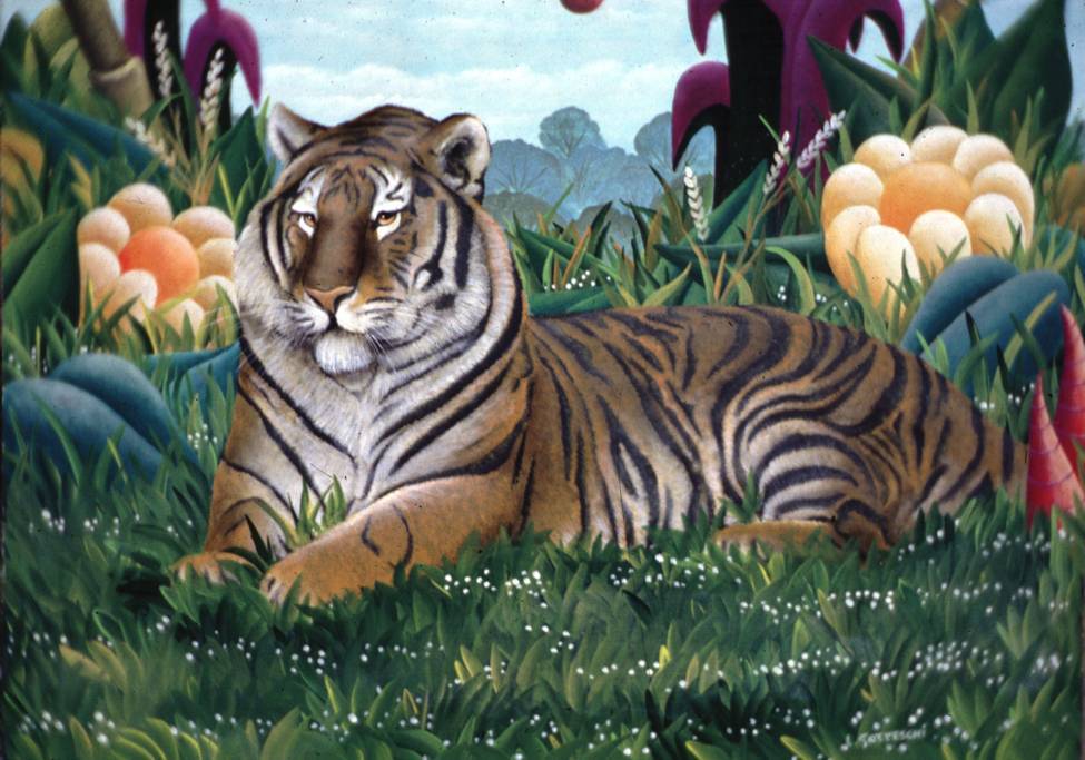 Na obrazie widać majestatycznego tygrysa, leżącego pośrodku bujnej dżungli. Intensywne barwy, takie jak głęboka zieleń liści oraz ciepłe odcienie tygrysiego futra, przyciągają uwagę. Tygrys, z jego spokojnym, niemalże zadumanym wyrazem pyszczka, zdaje się być królem tej egzotycznej sceny. Wokół niego rosną kolorowe kwiaty i fantazyjne rośliny, które nadają obrazowi magiczną atmosferę, jakby przeniesioną z baśni. Malarz zastosował wyraziste kontury i płaską perspektywę, co przypomina trochę stylizowany świat z dziecięcych ilustracji. Wygląda prawie jak z "The Jungle Book". Tygrys, choć groźny, emanuje spokojem i godnością. Może sprawić, że poczujesz nutkę podziwu, ale i delikatnego niepokoju. Czy ten tygrys zastanawia się nad sensem życia? A może tylko drzemie i myśli: „Ciekawe, co na obiad?” Obraz jest pełen życia i wewnętrznej energii. Dynamika między naturą a tygrysem tworzy harmoniczną całość. Drobne detale, jak krople rosy na trawie, dodają realizmu i przyciągają wzrok. Mimo to styl jest nieco naiwny, z akcentem na linearną kompozycję i żywe barwy. Całość wywołuje mieszane uczucia – od zachwytu po zadumę nad dziką naturą. It’s like stepping into a dream. A dziecko mogłoby pomyśleć: "Tygrys to mój przyjaciel w jakimś magicznym lesie."