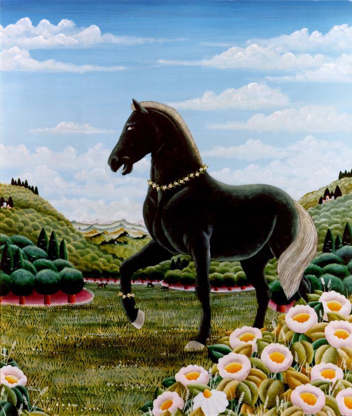 Obraz przedstawia majestatycznego czarnego konia na tle malowniczego krajobrazu. Głębokie zielenie i jasne błękity komponują się w harmonijną scenę. Koń, ozdobiony złotymi koralami, stoi dumnie, jakby gotowy do galopu. W tle widać łagodne wzgórza pokryte gęstymi drzewami, przypominające puszyste chmurki na górze. Na pierwszym planie kwitną piękne różowe kwiaty, które dodają całości ciepła i świeżości. Atmosfera jest idylliczna i spokojna, z nutą elegancji. Obraz emanuje klasycznym stylem, z wyraźnym dbałością o detale i kolory. Artysta stosuje techniki olejne, które pozwalają na uzyskanie gładkich przejść tonalnych, co dodaje głębi całemu przedstawieniu. Działo pensie przekazywać uczucie harmonii z naturą i piękna w prostocie. To jak w bajce! Konik przypomina o dziecięcej radości i beztrosce. It's magical. Patrząc na ten obraz, można poczuć ciepło i spokój. Może nawet tęsknotę za przeszłością pełną podobnych, sielankowych dni. Artystyczna wizja wciąga widza, skłaniając do zastanowienia się nad pięknem zwykłych chwil. Coś w tym obrazie przywołuje wspomnienia spacerów po łąkach i zapachu kwitnących kwiatów. Obraz zachęca do oderwania się od codzienności i zanurzenia się w tym cudownym świecie wyobraźni.