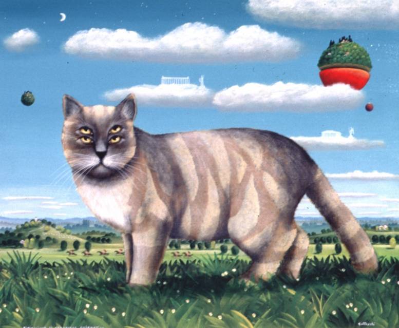 Obraz przedstawia surrealistyczny krajobraz z kotem o dwojakiej naturze. Jego futro mieni się różnymi odcieniami szarości i białości, dodając mu mistycznego uroku. Na pierwszy rzut oka widzimy szeroką łąkę, na której stoi olbrzymi kot ze zdublowanymi oczami. Tło zdobi intensywnie błękitne niebo z puszystymi obłokami oraz unoszący się na horyzoncie zielony glob z czerwonym spodem. Elementy te przywodzą na myśl senne marzenia lub magiczną rzeczywistość. Atmosfera obrazu jest przesycona poczuciem intrygi i tajemnicy. Niebo, które jest nieco za spokojne, zestawione z dziwacznymi obiektami, nadaje scenie enigmatyczny nastrój. Artysta wykorzystał finezyjną technikę łączenia realistycznych detali z elementami fantasy, tworząc surrealistyczny melanż. Kolory są żywe, a użycie kontrastu przyciąga oko widza, jakby chciał powiedzieć "look, to coś niesamowitego!". Obraz wzbudza w widzach poczucie zdumienia i ciekawości. Przywodzi na myśl idee wolności i nieskończoności możliwości. Szaleństwo surrealizmu odzwierciedla emocje, które kołowrotkują w głowie, od zachwytu po lekkie zaniepokojenie. Można by rzec, że to coś jak z opowieści, gdzie wszystko jest możliwe w krainie marzeń. "Kotek na niebie biega po chmurach!" napisałoby małe dziecko. Obraz stanowi ciekawą mieszankę sztuki i iluzji.