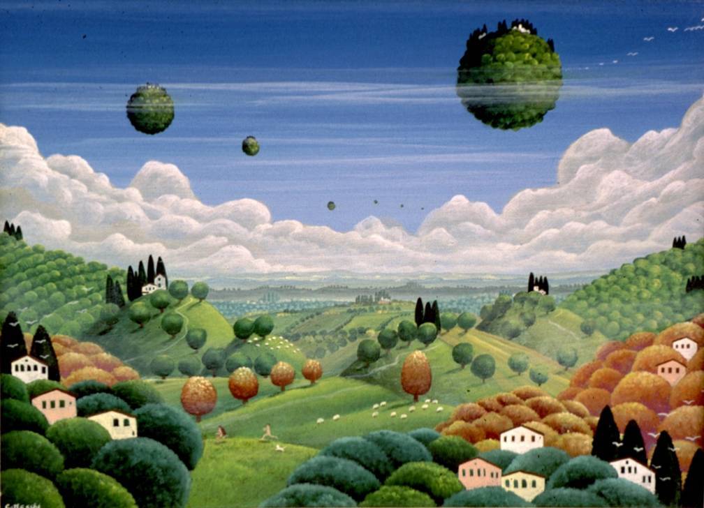 Obraz przedstawia sielankowy krajobraz z zielonymi, falistymi wzgórzami, na których usadowiły się białe domki z czerwonymi dachami. Po niebie suną puszyste obłoki, a w oddali widać fruwające, kuliste wysepki pokryte gęstą roślinnością. Cudne to widok i taki surrealistyczny! Kolory dominujące to zieleń, różne odcienie niebieskiego oraz ciepłe brązy i pomarańcze, które dodają obrazowi dynamiki i ciepła. Atmosfera dzieła jest spokojna, niemal magiczna, stwarzając wrażenie, że wszystko w tym świecie jest możliwe. Malarski styl jest na granicy impresjonizmu i surrealizmu. Artysta posłużył się miękkimi, płynnymi pociągnięciami pędzla, co sprawia, że obraz wydaje się niemalże oddychać. Patrząc na niego, można poczuć się jak w baśni. „Chciałbym tam zamieszkać!”, mogłoby powiedzieć dziecko. Interpretacje mogą być różne – dla jednych to wizja spokoju, dla innych zaproszenie do marzeń. To naprawdę dreamy miejsce, które zachęca do odpoczynku od codziennych zmartwień.