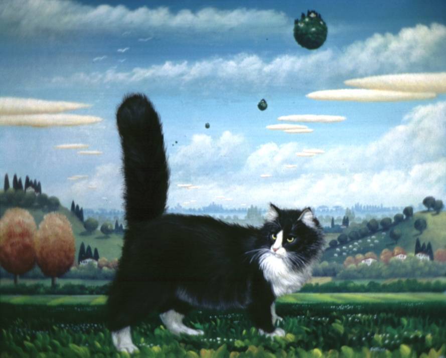 Na obrazie widzimy czarno-białego kota, który stoi na zielonej łące, a jego uwaga skupiona jest na tajemniczych kulach unoszących się w powietrzu. Kocur wygląda na zaintrygowanego, jakby chciał się dowiedzieć, co do licha tam się dzieje. Tło malowane jest z dużą delikatnością - niebo błękitne, przyozdobione białymi chmurami, które wyglądają jak wata cukrowa. Krajobraz jest sielski, przypominający pocztówkę z wiejskiego spaceru. Drzewa o pastelowych barwach, pomarańczowo-różowe, dodają ciepła i spokoju. Cała scena ma trochę surrealistyczny nastrój. Artysta zastosował miękkie pociągnięcia pędzla, co nadaje obrazowi dreamlike quality. Widać, że technika jest przemyślana, a kolorystyka dobrze dobrana. Obraz ten mógłby wzbudzać w widzu uczucie zaciekawienia, a nawet niepokoju, ale też lekkość i radość, tak jakby mówił - świat jest pełen tajemnic. Ciekawe, co by zrobił ten kot, gdyby mógł te kule dotknąć. Moje małe serce czuje wtedy warm feelings. Dzieciak by powiedział: "Kotki są fajne bo mają puszyste ogonki". Cała kompozycja przyciąga wzrok i sprawia, że chcemy pozostać w tym momencie jeszcze chwilę dłużej, zastanawiając się nad tym, co widzimy i co jeszcze może się wydarzyć, jeśli tylko fikniemy na chwilę poza realność.