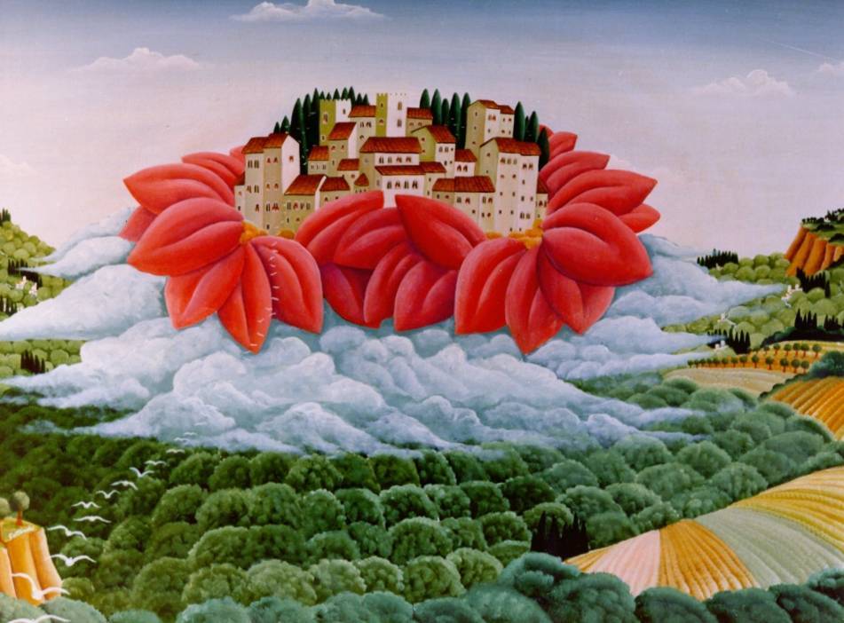 Na obrazie widzimy niesamowity, surrealistyczny widok. W samym centrum znajduje się miasto, które wydaje się unosić na ogromnym kwiecie. Płatki tego kwiatka są intensywnie czerwone, kontrastujące z miękkimi, białymi chmurami. Budynki, przypominające włoskie miasteczko, mają ciepłe, pastelowe barwy - delikatne żółcie i brązy. Cała kompozycja zdaje się balansować na granicy snu i jawy. Wow, pływające miasta to super pomysł, prawda? Atmosfera obrazu jest niecodzienna, trochę magiczna. Można poczuć, jakbyśmy wkroczyli do bajki. Artysta użył techniki olejnej, co nadaje głębi i gładkości kolorom. Styl przypomina naiv art z elementami surrealizmu. Patrząc na to dzieło, można pomyśleć o odcięciu od zgiełku świata, o ciepłym, spokojnym miejscu gdzieś w chmurach. Strzelające z ziemi kolorowe pola dodają ciepła i przytulności, dając nadzieję, że takie magiczne miejsca istnieją naprawdę. Nie da się nie uśmiechnąć, czując tę "dreamlike" atmosferę. Każdy patrzący może interpretować obraz inaczej - dla jednych to symbol izolacji, dla innych ucieczki do krainy marzeń. Jest w tym coś dziecinnego, jakby artysta pozwalał nam wrócić do czasów, gdy wszystko było możliwe. To prawdziwy festiwal wyobraźni ukryty na płótnie.