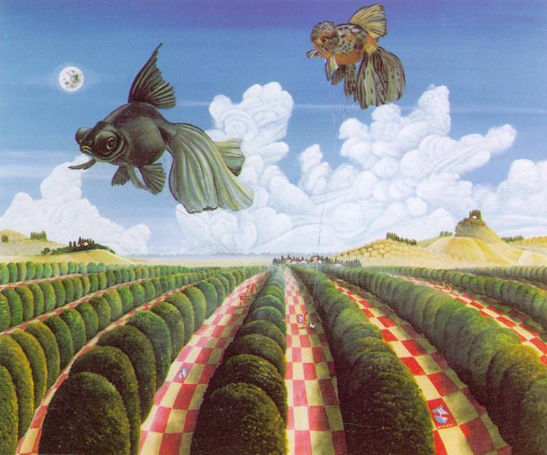 Na obrazie widzimy surrealistyczną scenę, która przypomina senne marzenie. Nad szachownicowym polem unoszą się dwie dziwaczne, latające ryby, jakby zapomniały, że ich miejsce jest w wodzie. Kolory są nasycone, dominują zielenie i błękity, które nadają całości spokojny klimat. Jednak obecność ryb wlatujących w niebo dodaje całości lekkiego niepokoju. Kompozycja jest dynamiczna, z wyraźną perspektywą prowadzącą wzrok w głąb obrazu. Artysta korzysta tutaj z technik charakterystycznych dla realizmu magicznego. Dbałość o detale i precyzja w oddawaniu kształtów dodaje obrazowi niezwykłości. Wiatrak w oddali, kosmata chmura – wszystko to łączy się w harmonijną, choć nieco szaloną całość. Patrząc na to dzieło, można poczuć się jak w świecie z innej bajki. Z jednej strony to humorystyczna scena, z drugiej - inspirująca refleksję o ucieczce od rzeczywistości. To trochę jak w bajce, w której wszystko jest możliwe. Wow! Czy te ryby mogą naprawdę latać? – pytałoby dziecko. A może to tylko metafora, ukryta opowieść o wolności i wyzwoleniu? Tak czy owak, ten obraz to prawdziwy mind-blowing experience, który sprawia, że na chwilę zatrzymujesz się i zagłębiasz w marzenia. Aż chce się tam być, prawda?