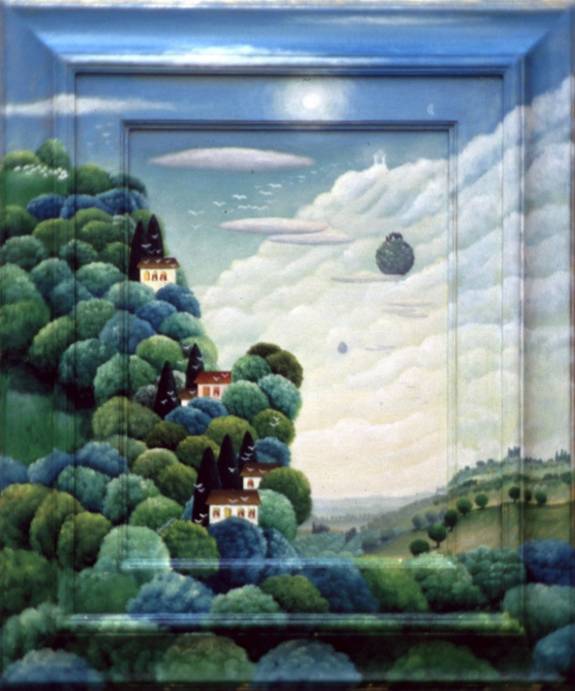 Obraz emanuje spokojem i tajemniczością. Dominuje tu zieleń lasów, przerywana akcentami ciepłych dachów domków, które ukryły się wśród bujnych drzew. Te drzewa przypominają puchate chmury, a ich zieleń zdaje się być żywa i namacalna. Niebieski nieboskłon jest delikatnie pokryty chmurami, które wyglądają jak pływające waty cukrowe. Kompozycja obrazu przypomina okno, przez które możemy zajrzeć do krainy marzeń. Artystyczny styl to połączenie realizmu z surrealistycznym twistem. Użycie płynnych pociągnięć pędzla tworzy efekt snu. Domki wiszące na zboczu wydają się, że mogłyby toczyć się w dół jak kule w kręglach. Atmosfera obrazu jest idylliczna, trochę jak sweet dream, zachęcająca do refleksji. Widok ten może budzić w odbiorcy uczucie nostalgii za utraconym dzieciństwem, gdzieś w tle słychać śmiech bawiących się dzieci. Ala myślała, że to górska przygoda z bajki. Kiedy patrzę na ten obraz, czuję spokój i zauważam, jak świat natury i człowieka współgrzeją w idealnej harmonii. To dzieło sprawia, że pragniesz tam być, otoczyć się tym bezczasowym pięknem, poczuć zapach lasu i wdychać świeże powietrze. Cudo sztuki i marzeń.