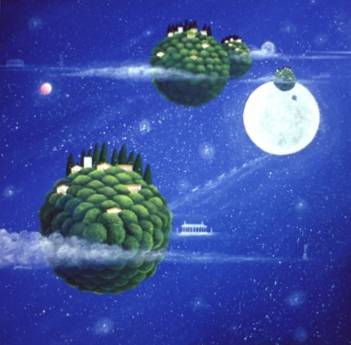 Na obrazie widzimy niezwykły, surrealistyczny krajobraz kosmiczny. Dominują odcienie błękitu i zieleni, które wprowadzają widza w bajkowy świat. Na pierwszym planie unoszą się zielone, kuliste wyspy porośnięte bujną roślinnością i małymi domkami, które wyglądają jakby były zaczarowane. Niebo jest usiane gwiazdami i delikatnymi chmurami, a po prawej stronie widnieje jasny księżyc. Wow, wygląda jak z mojej książki o kosmosie! Obraz emanuje spokojem i ciepłem, ale jednocześnie wzbudza ciekawość. Artysta zastosował technikę olejną, co nadaje kompozycji miękkości i głębi. Kontury są delikatne, co sprawia, że elementy zdają się płynnie przechodzić jedno w drugie. Jest w tym jakiś dreamy element, który przyciąga uwagę. Całość może wywoływać uczucia marzycielstwa i tęsknoty za nieznanym. Można się tu zagubić, zastanawiając się, co znajduje się na tych tajemniczych wyspach. To dzieło pobudza wyobraźnię i zachęca do refleksji nad możliwością życia w alternatywnych światach. Zdecydowanie wciąga, pozostawiając w sercu ciepłe echo.