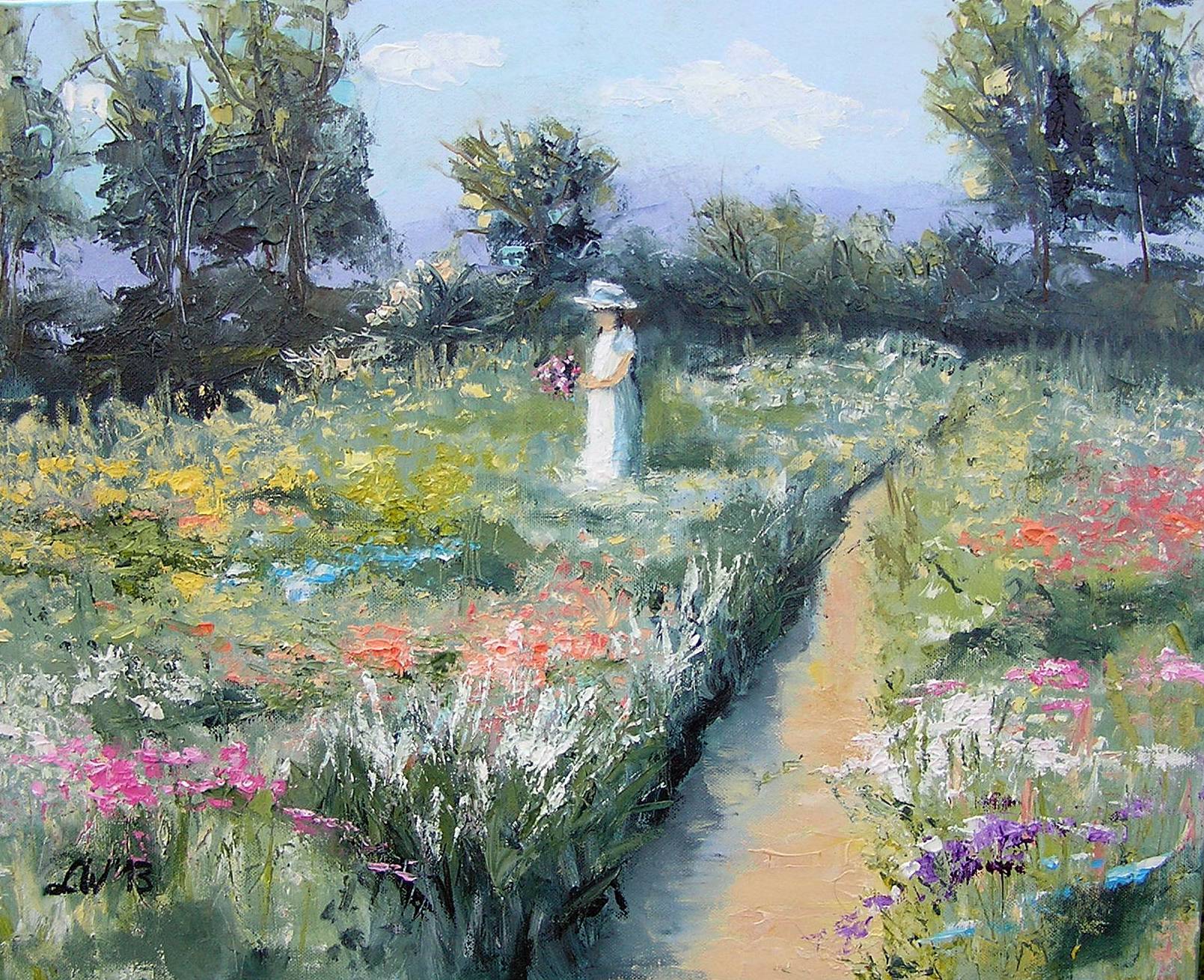 Na obrazie widzimy sielankowy krajobraz pełen kolorowych kwiatów. Pastelowe barwy dominują, z przewagą zieleni i błękitu, przeplatając się z różami, żółciami i bielenią roślinności. Kompozycja prowadzi wzrok w stronę postaci kobiety w białej sukni, stojącej pośród pola, jakby zamyślonej. Wygląda na to, jakby czas zatrzymał się w tym magicznym miejscu. Atmosfera malarska bije spokojem i ciszą, przywodzi na myśl leniwe popołudnie w letni dzień. Styl malarski jest impresjonistyczny. Artysta wykorzystuje technikę grubych pociągnięć pędzla, które dodają tekstury i głębi. Łączą się tu wszelkie wzory i odcienie, tworząc harmonijną całość. Patrząc na obraz, czuć ciepło promieni słonecznych na skórze i lekki powiew wiatru przynoszący zapach kwiatów. Można wyobrazić sobie bzyczenie pszczół, które przelatują z kwiatka na kwiatek. "Ta pani pewnie lubi kwiatki" – mogłoby powiedzieć dziecko, zauważając postać. Obraz wywołuje tęsknotę za prostymi przyjemnościami, jak spacer po polu. To idyllic picture, który zabiera nas w podróż do świata piękna i spokoju. Jest coś niezwykle kojącego w tym dziele, jakby czas na moment przestał biec i pozwolił cieszyć się chwilą. Nie można oderwać wzroku od tej harmonii, która emanuje z każdego pociągnięcia pędzla.