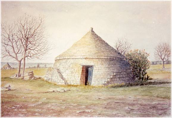 Obraz ukazuje spokojną scenę na wsi, gdzie w centrum zauważamy charakterystyczną budowlę, przypominającą tradycyjne trullo. Kamienna konstrukcja ma stożkowy dach i jest otoczona przez nagie drzewa oraz delikatnie zarośnięte krzewy. Kolory są stonowane i pastelowe, dominują beże, zielenie oraz błękity, tworząc harmonijną kompozycję. Nastrój obrazu jest cichy, niemal senny, przenosząc nas w miejsce, gdzie czas zdaje się płynąć wolniej. Artysta zastosował technikę akwareli, co nadaje dziełu lekkości i subtelności. Linie są delikatne, a cienie ledwie zaznaczone, wyczarowując aurę nostalgii. Patrząc na ten obraz, można poczuć chłodny powiew wiatru i zapach ziemi po deszczu. Dla mnie jest to taki mały kawałek raju, gdzie wszystko jest w perfect harmony. Ten obraz jest jak bajka, gdzie króluje spokój i zrozumienie. Może ktoś pomyśli o dzieciństwie na wsi lub o beztroskich chwilach spędzonych na łonie natury. To zdjęcie jest naprawdę cool, jak powiedziałby 7-latek. Z jednej strony formalność w przedstawieniu detali, z drugiej ta swobodna melancholia prowincjonalnego życia zachwyca. Obraz pobudza wyobraźnię, zmuszając do refleksji nad prostotą i pięknem codzienności.