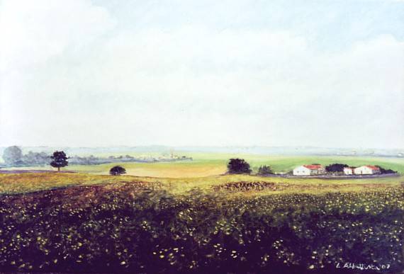 Obraz przedstawia malowniczy krajobraz wiejski, rozciągający się aż po horyzont. Dominują tu delikatne zielenie i brązy, przechodzące w pastelowe odcienie nieba. Kompozycja ma w sobie spokój, jakby czas się zatrzymał; pola są nieskazitelnie równe, z naturalnymi wzgórzami i pojedynczym drzewem po lewej stronie, które dodaje charakteru. Na horyzoncie można dostrzec kilka małych domków, białe z czerwonymi dachami, które wyglądają jak z bajki. Atmosfera jest ciepła i spokojna, emanuje z niej leniwy letni dzień. Styl jest realistyczny, z domieszką impresjonizmu. Artysta używa miękkich pociągnięć pędzla, by oddać mgiełkę na niebie. Technika zdaje się być na luzie, choć każdy detal jest przemyślany. Obraz przywodzi na myśl uczucie nostalgii za prostszymi czasami, kiedy życie płynęło wolniej. "Look, cows!" — tak by to pewnie wykrzyknęło dziecko. Wpatrując się dłużej, można poczuć tęsknotę za ucieczką od miejskiego zgiełku. Ten widok to jak głośne westchnięcie natury. Trochę mnie wzrusza ten spokój, bo to takie uczucie, które rzadko można spotkać. Artysta naprawdę uchwycił istotę sielanki.