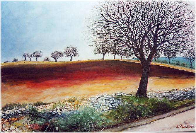 Ten obraz to prawdziwa uczta dla oczu. Dominują na nim ciepłe, ziemiste kolory, z intensywnym czerwonym i złotym, które przeplatają się na miękkich wzgórzach w tle. Na pierwszym planie widzimy nagie drzewa, których gałęzie rozpościerają się jak misterne koronki na bladoniebieskim niebie. Jest coś niezwykle nostalgicznego w kompozycji tego obrazu. Atmosfera zdaje się być spokojna, niemal melancholijna, jakby to był ostatni dzień jesieni przed nadejściem zimy. Artyszta użył techniki, która dodaje obrazowi pewnej warstwistości, mieszając delikatne pociągnięcia pędzla z bardziej wyrazistymi liniami. Ta kombinacja nadaje dziełu dynamiczny feeling, a jednocześnie zachowuje jego wewnętrzny spokój. Niektóre elementy wyglądają jak wyjęte z dziecięcej wyobraźni, co może budzić ciepłe uczucia u odbiorcy. Drzewka wyglądały tak smutno, ale było też pięknie! Patrząc na ten obraz, można poczuć lekki zew natury i delikatne przypomnienie o ulotności czasu. To takie "wow" uczucie, które chwyta za serce. Każdy szczegół jest niczym opowiadana historia, a widz może w niej odnaleźć własne emocje i wspomnienia.