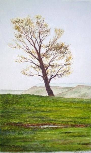 Obraz ukazuje samotne drzewo na tle zielonej łąki. Dominują kolory natury: intensywna zieleń trawy, ciemny pień drzewa i złotawe liście, które tańczą na wietrze. W tle majaczą łagodne wzgórza w pastelowych odcieniach. Kompozycja jest prosta i niezwykle spokojna, ale skrywa pewną dynamikę - drzewo zdaje się lekko przechylać, jakby chciało do nas przemówić. Atmosfera obrazu jest refleksyjna, niemal melancholijna. Czuję się, jakbym wszedł w scenę z bajki, gdzie czas płynie inaczej. Artysta wykorzystał subtelne pociągnięcia pędzla, by oddać delikatność natury. Technika zdaje się być połączeniem realizmu i impresjonizmu. Detale są dopracowane, ale to ogólny wyraz wywołuje największe wrażenie. Patrząc na obraz, można poczuć spokój, ale i lekką tęsknotę. Drzewo może symbolizować przetrwanie i siłę w obliczu samotności. It's beautiful. Dla dziecka to jak magiczne drzewo z księgi baśni, które skrywa niewidoczne tajemnice. Myśląc o tym wszystkim, czuję ciepło, jakbym był na łące, gdzie wszystko jest możliwe.