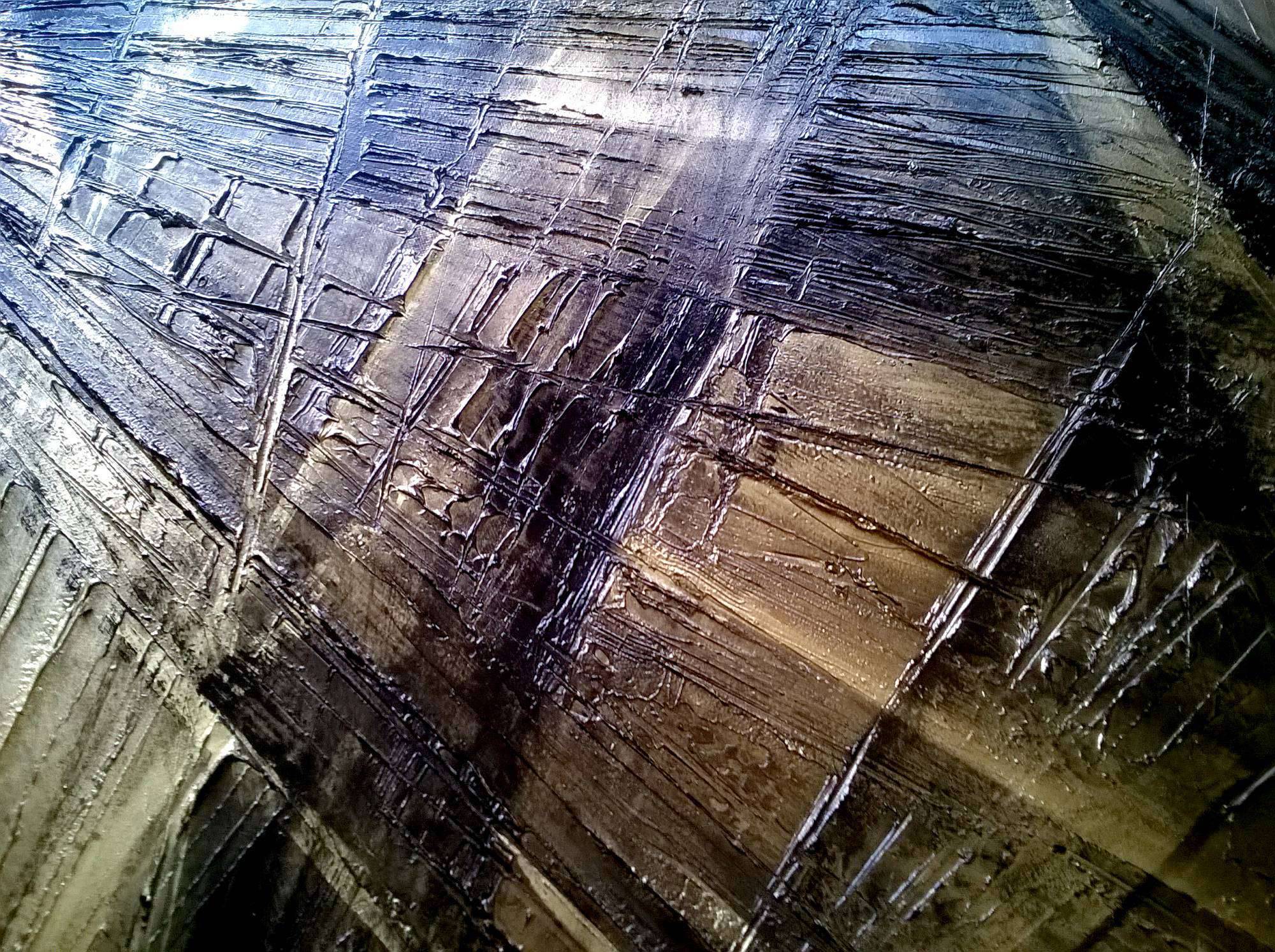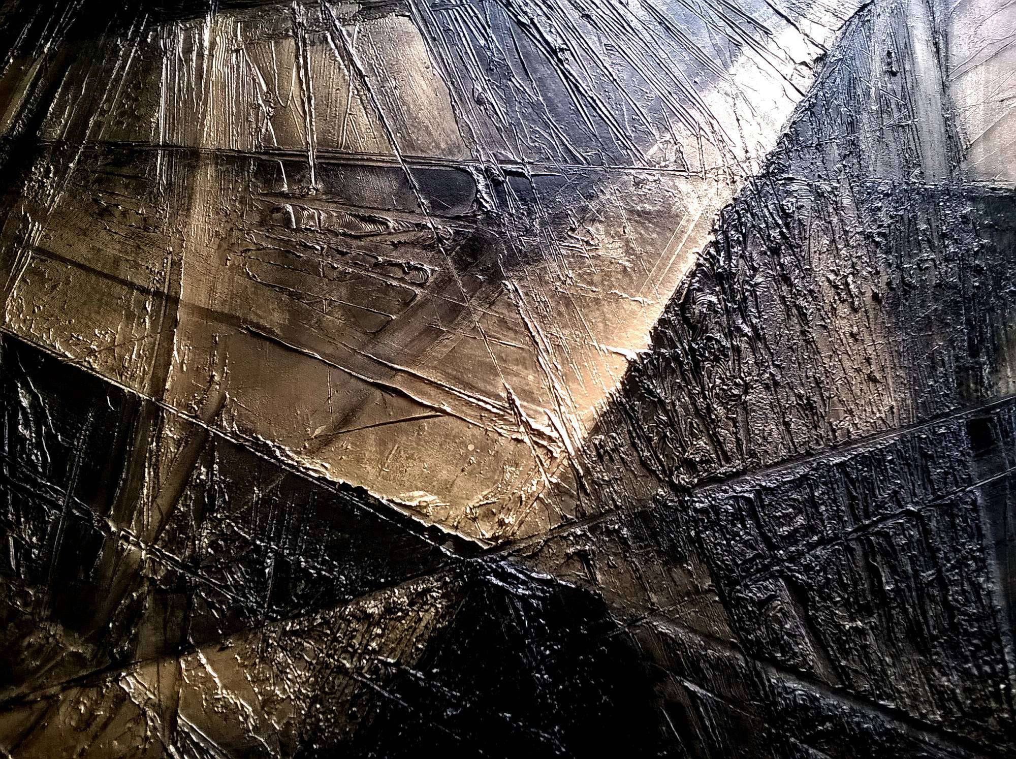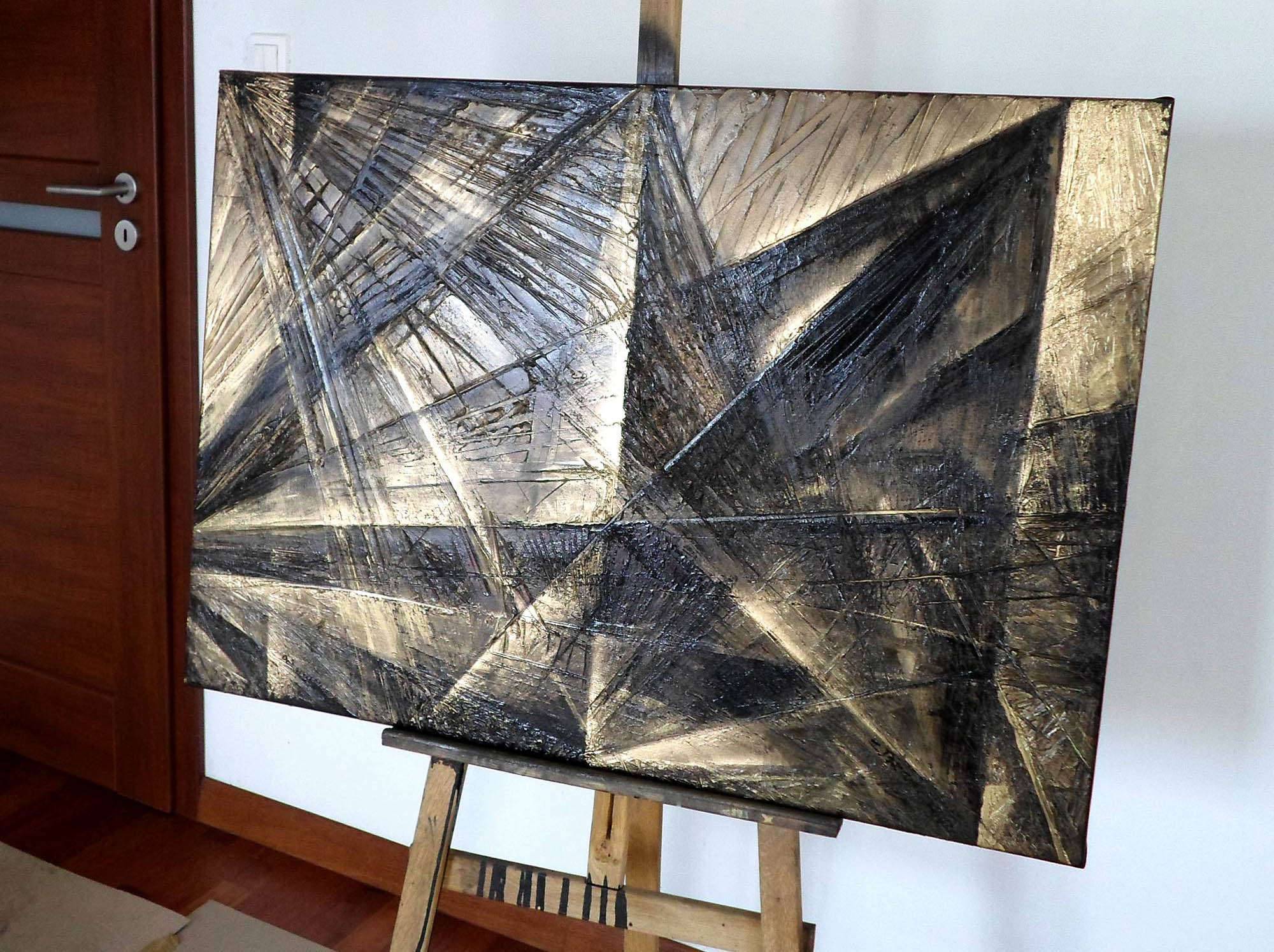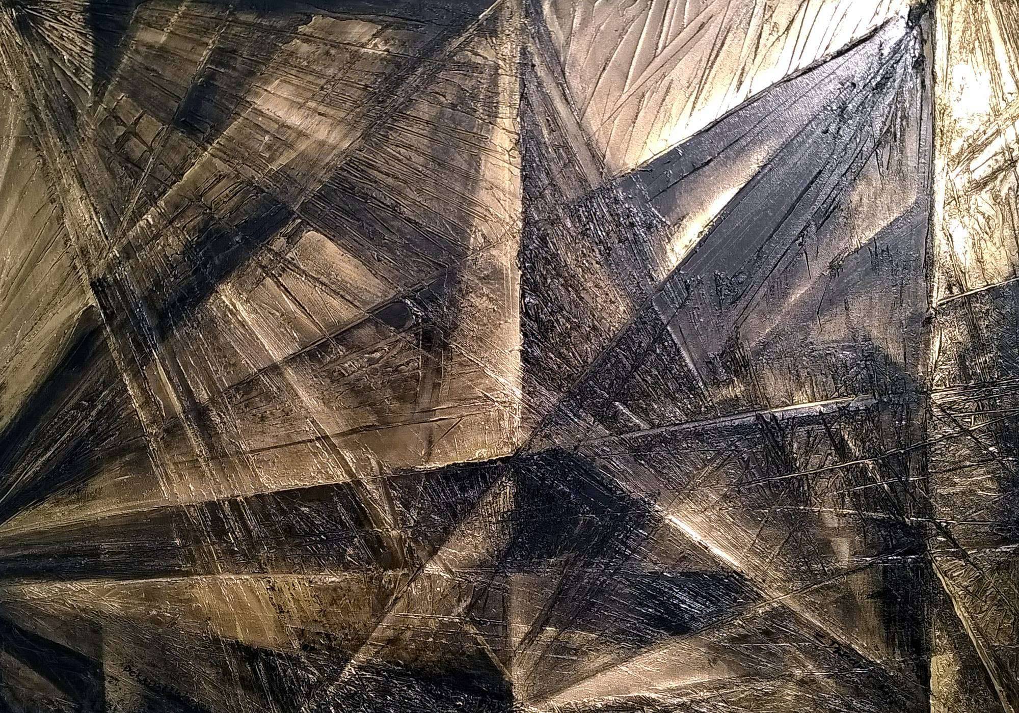 Obraz przyciąga wzrok intrygującymi kształtami, które układają się w kalejdoskop chaotycznych trójkątów i linii. Szaro-złote tony napawają widza dwojakimi uczuciami. Z jednej strony, matowe pojawianie się koloru nadaje surowości, z drugiej - lśniące akcenty przypominającego złoto wprowadzają nutę elegancji. To trochę jak oglądanie zamkniętego w ramkach fragmentu świata, który balansuje między uporządkowaniem a nieładem. Atmosfera emanuje tajemniczością. Patrząc na to, czuję dreszcz emocji, jakby odkrycie jakiegoś ukrytego znaczenia było na wyciągnięcie ręki. Technicznie rzecz biorąc, artysta zastosował technikę impasto, dając powierzchni obrazu teksturę i głębię. Naprawdę fajne! Interpretacje mogą być różne. Ktoś zobaczy w tym problem bądź chaos życia, inny dostrzeże strukturę i piękno w chaosie (tak, brzmi paradoksalnie). Styl obrazu przypomina mi coś z "abstract" art. Dziecko by powiedziało: "To wyglada jak giganticzne klocki lego snap together ze złotem!" Wiesz, czasem sztuka to po prostu emocjonalna jazda bez trzymanki. Fascynujące, co?