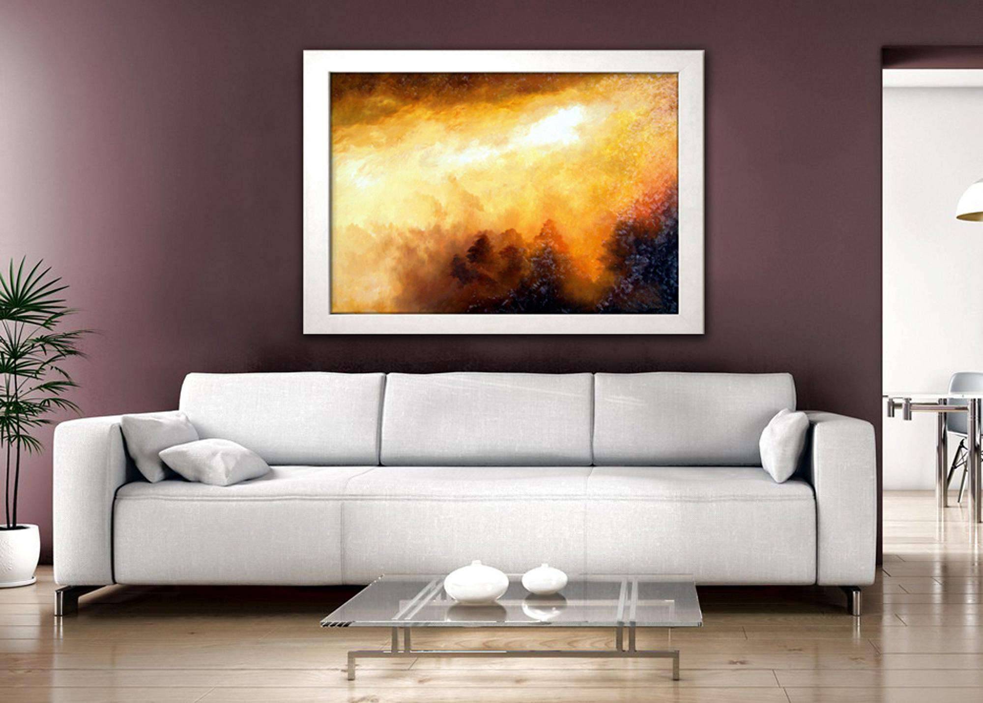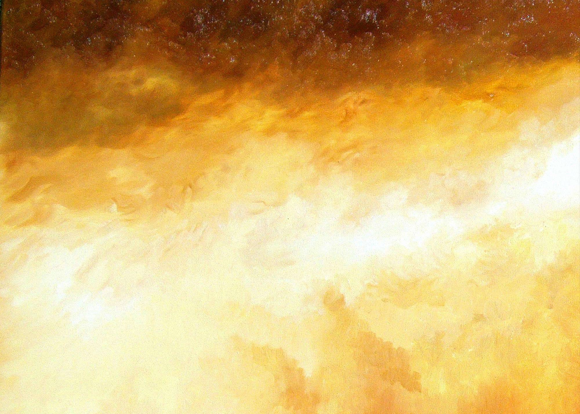 Na obrazie dominuje intensywna paleta złotych, pomarańczowych i brązowych odcieni, które tworzą dynamiczną kompozycję przypominjącą wschód słońca lub pożar na horyzoncie. Barwy miękko się przenikają, tworząc efekt mgły lub dymu, co sprawia, że całość wydaje się niemalże organiczna – żywa. Góra obrazu jaśnieje, podczas gdy ciemniejsze kształty u dołu przypominają drzewa, które z trudem przepuszczają światło. Atmosfera dzieła jest ciepła, jednak niepokojąca – mieszanka spokoju i ekspresji, jakbyśmy znaleźli się w środku magicznej chwili tuż przed zmianą. Styl przypomina impresjonizm, z naciskiem na spontaniczne pociągnięcia pędzlem i teksturę farby, która dodaje trójwymiarowości. Patrząc na obraz, można odczuć zachwyt i lekkie napięcie. Jakby unosić się pomiędzy snem a jawą. To trochę jak oglądanie magic clouds, gdzie wszystko jest możliwe. 7-letnie dziecko mogłoby powiedzieć “Wow, niebo się pali!” Emocjonalnie, dzieło skłania do refleksji nad tym, jak ulotne są piękne chwile. To artystyczne zaproszenie do zanurzenia się w krótkotrwałym pięknie światła i ciemności.