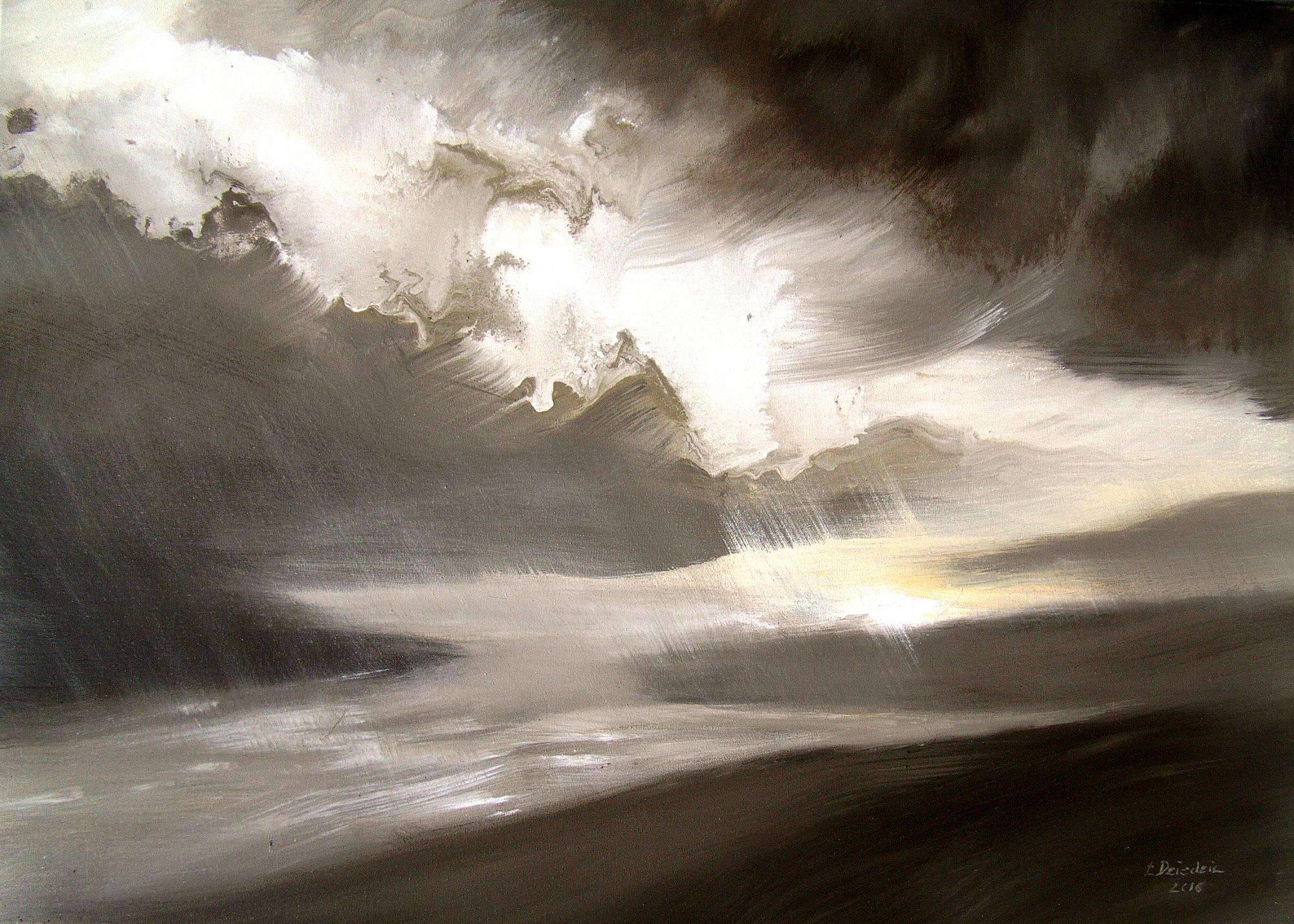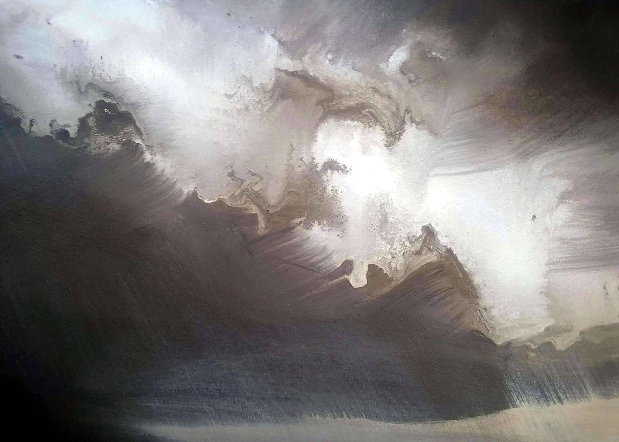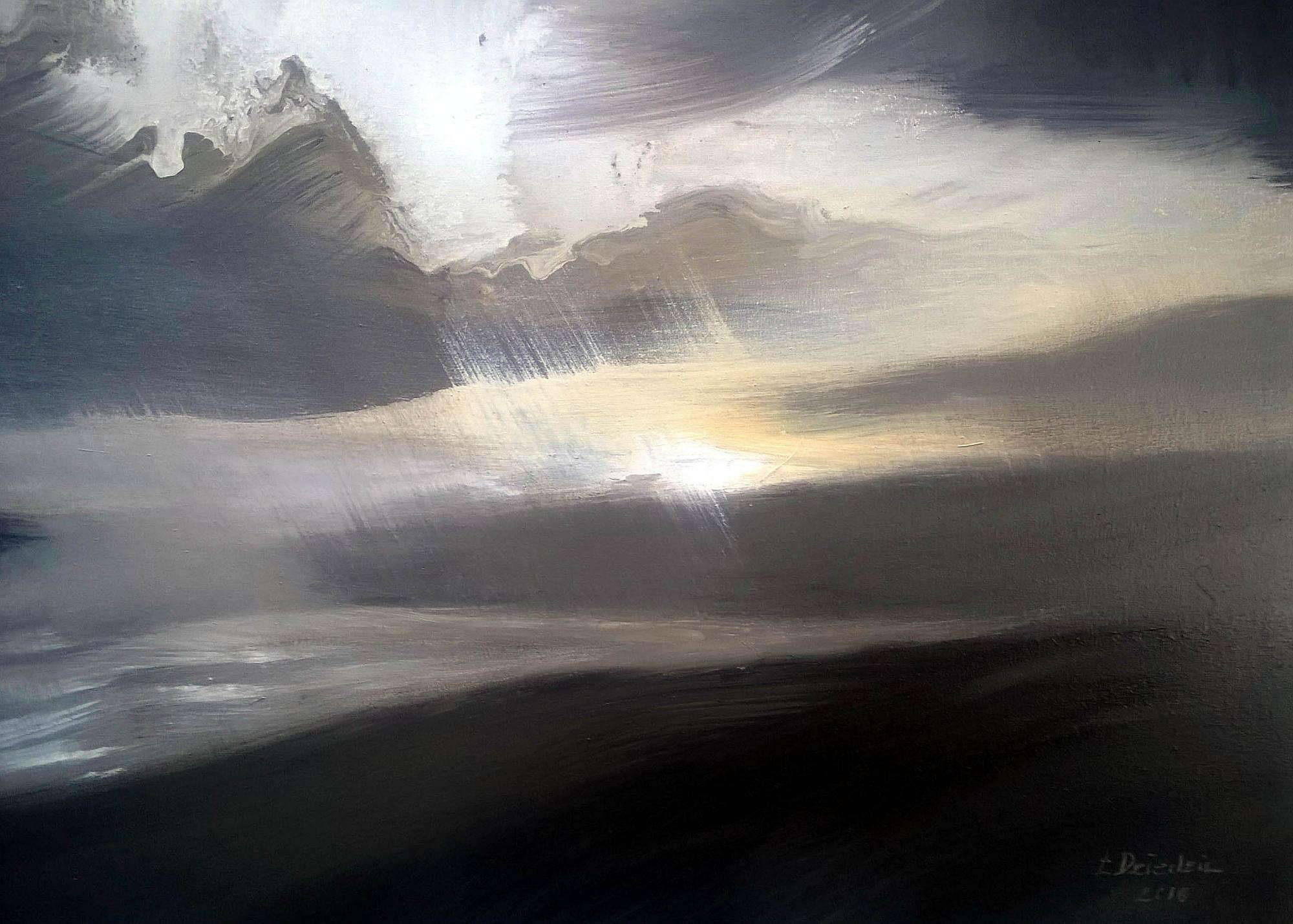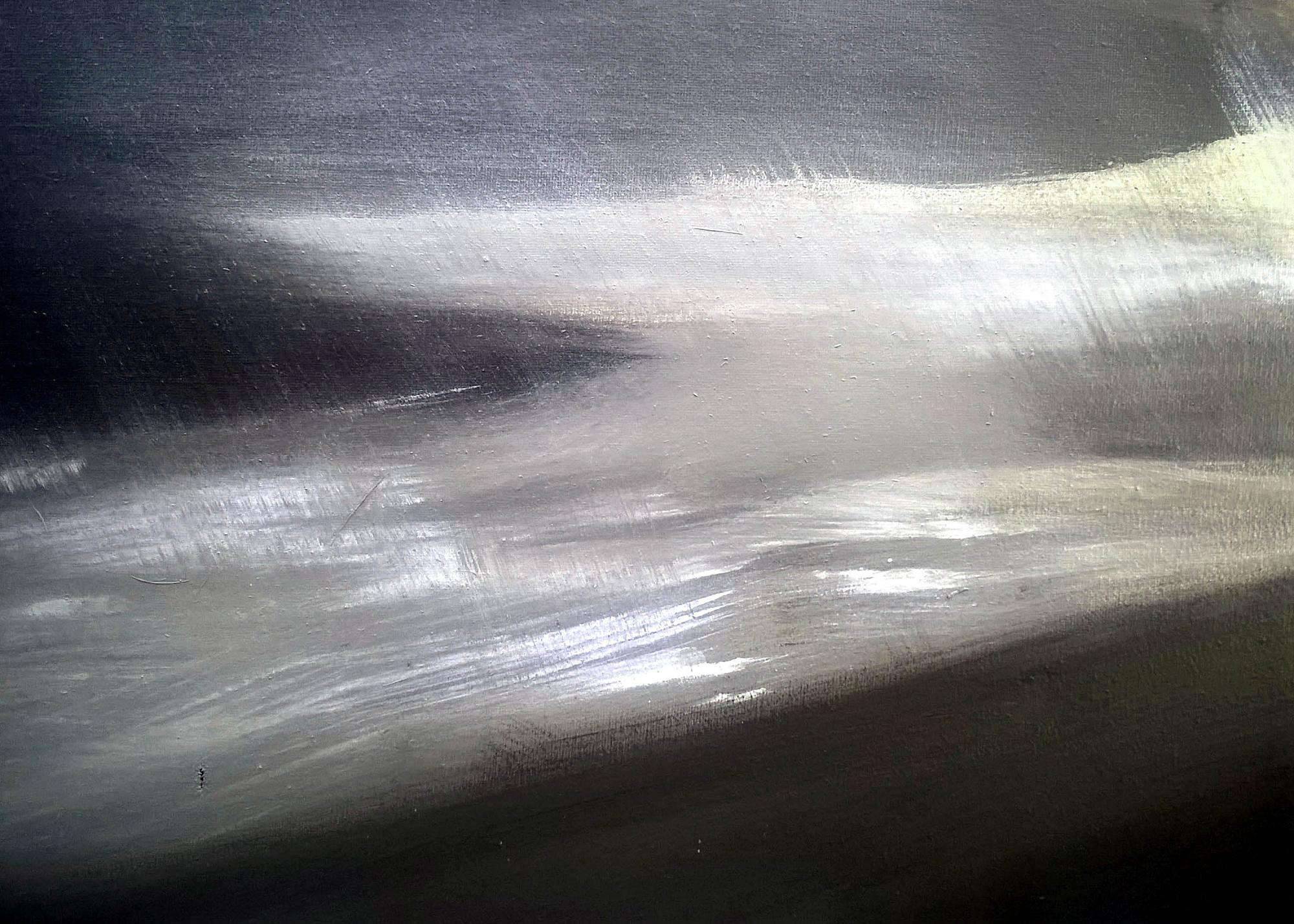 Obraz przedstawia fascynujące zjawisko, które można by opisać jako walkę światła i cienia. Dominują tu odcienie szarości, bieli i czerni, które tworzą dynamiczną kompozycję, przypominającą burzowe niebo nad spokojnym horyzontem. Światło przebijające się przez chmury subtelnie dodaje temu dziełu tajemniczego blasku. Wisząca w powietrzu napiętość zdaje się niemal namacalna. Obraz przypomina mi niebo po burzy, kiedy wszystko się uspokaja. Artysta zastosował technikę mieszania kolorów, co nadaje obrazowi płynności i ruchu. Pociągnięcia pędzla są wyraziste, a jednocześnie delikatne - to jest wręcz magiczne. Czy ten obraz sprawia, że czujesz się jak podczas deszczowego dnia? Patrząc na to dzieło, odbiorca może odczuwać spokój, ale i subtelną grozę. To mieszanka ulgi i refleksji, jak pogoda po burzy, która zaprasza do zadumy. Styl jest nowoczesny, a jednak w jakiś sposób klasyczny - a może to tylko moje wrażenie. To dzieło mówi mi, że nawet w najciemniejszych chwilach jest nadzieja. Ten painting wręcz zaprasza do pogłębionej analizy. Cudo!