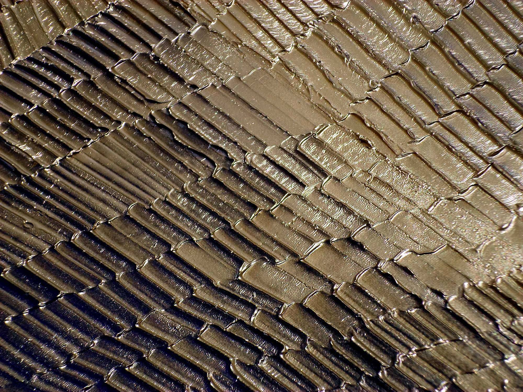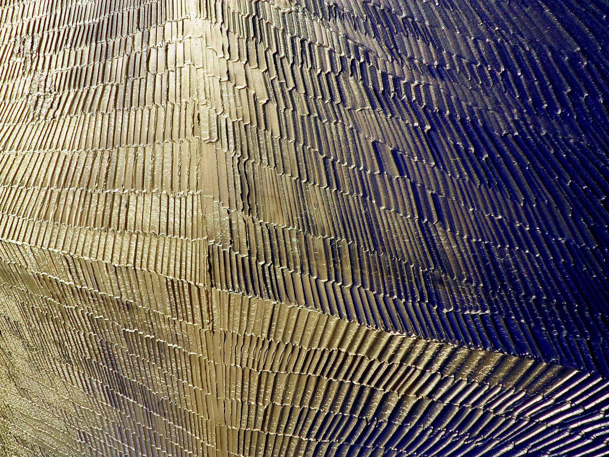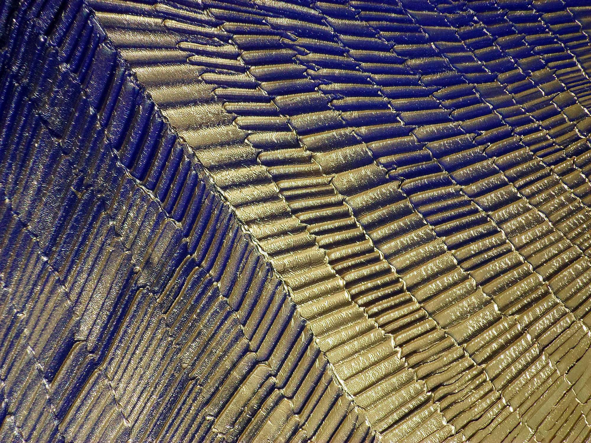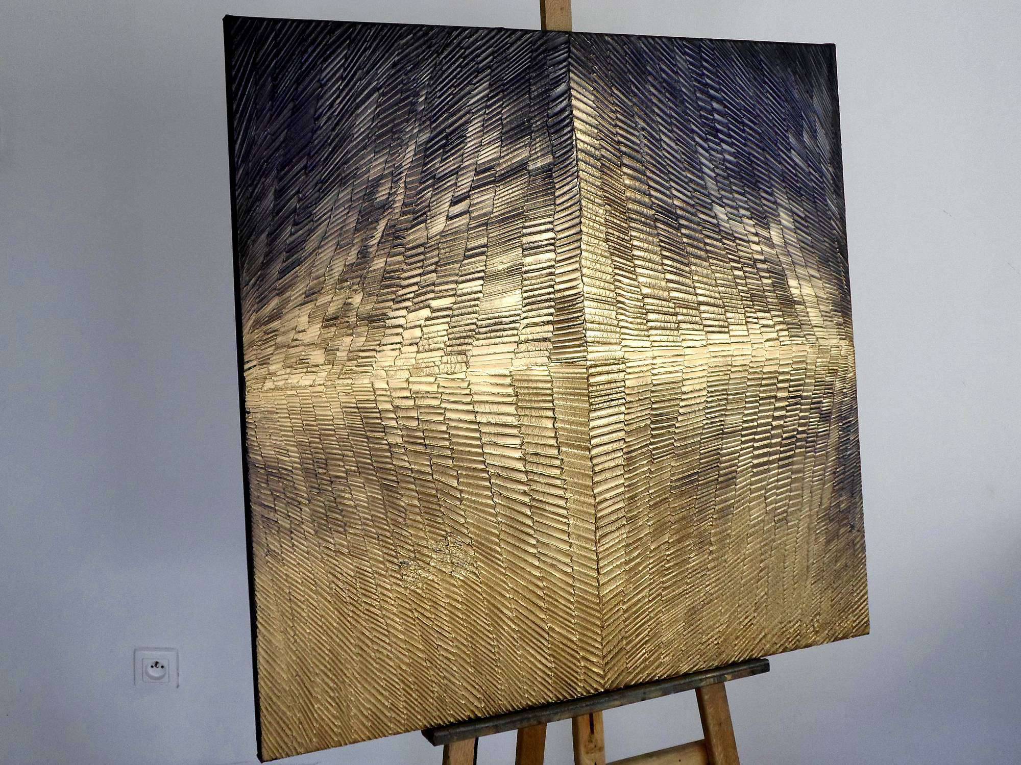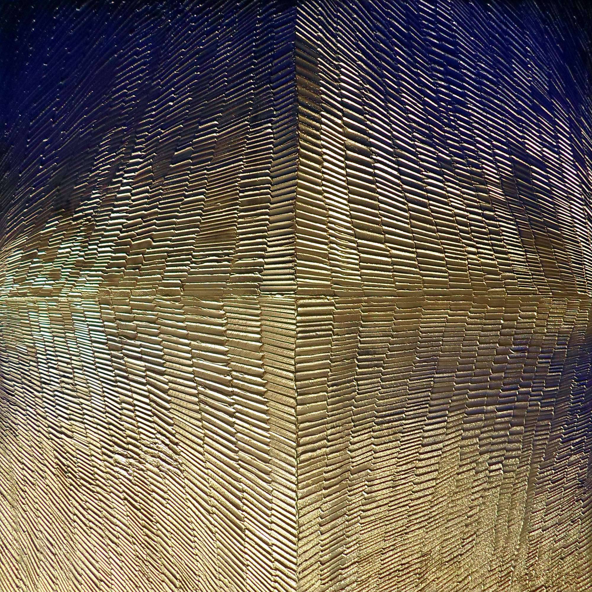 Na obrazie widzimy niezwykłą kompozycję przenikających się złotych i niebieskich tonów. Liczne paski układają się w dynamiczny wzór, tworząc wrażenie trójwymiarowości, jakbyśmy patrzyli na futurystyczny pejzaż. Kolory te wzajemnie się dopełniają, a przeplatające się linie dają poczucie rytmu i harmonii. Atmosfera dzieła jest tajemnicza i nieco hipnotyzująca, przyciągając wzrok i zachęcając do wnikliwej analizy. To jak pojawianie się jakiegoś "magic moment". Styl artysty można określić jako abstrakcyjny, z naciskiem na teksturę i głębię. Technika użyta do stworzenia tych struktur jest pełna precyzji, a jednocześnie spontaniczna, co sprawia, że obraz wydaje się być w ciągłym ruchu. Patrząc na niego, można poczuć jednocześnie spokój i niepewność, jakbyśmy stali na krawędzi nowego świata. Osoba oglądająca dzieło może odczuwać różne emocje. Jedni mogą czuć się zrelaksowani i usatysfakcjonowani, inni zaciekawieni i zaintrygowani. Dla mnie ten obraz przywołuje wspomnienia science fiction, światów pełnych nieodkrytych tajemnic. Kolory są jak złote promienie słońca odbijające się o spokojną wodę. Jak szedłem z mamą na spacerek, widziałem takie fajne wzorki. Dzieło jest przykładem, jak przez odpowiednie zestawienie barw i kształtów można wywołać głębokie refleksje. To jest jak wciągający portal do innej rzeczywistości.