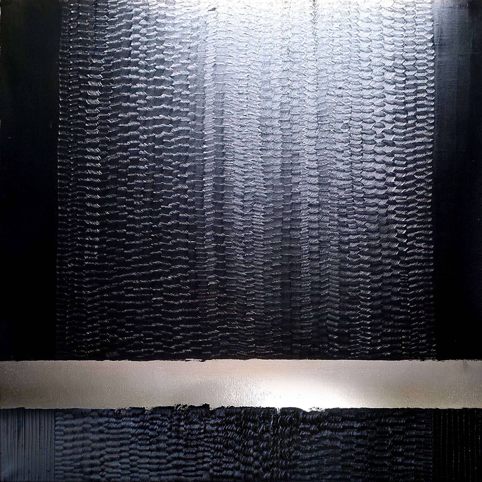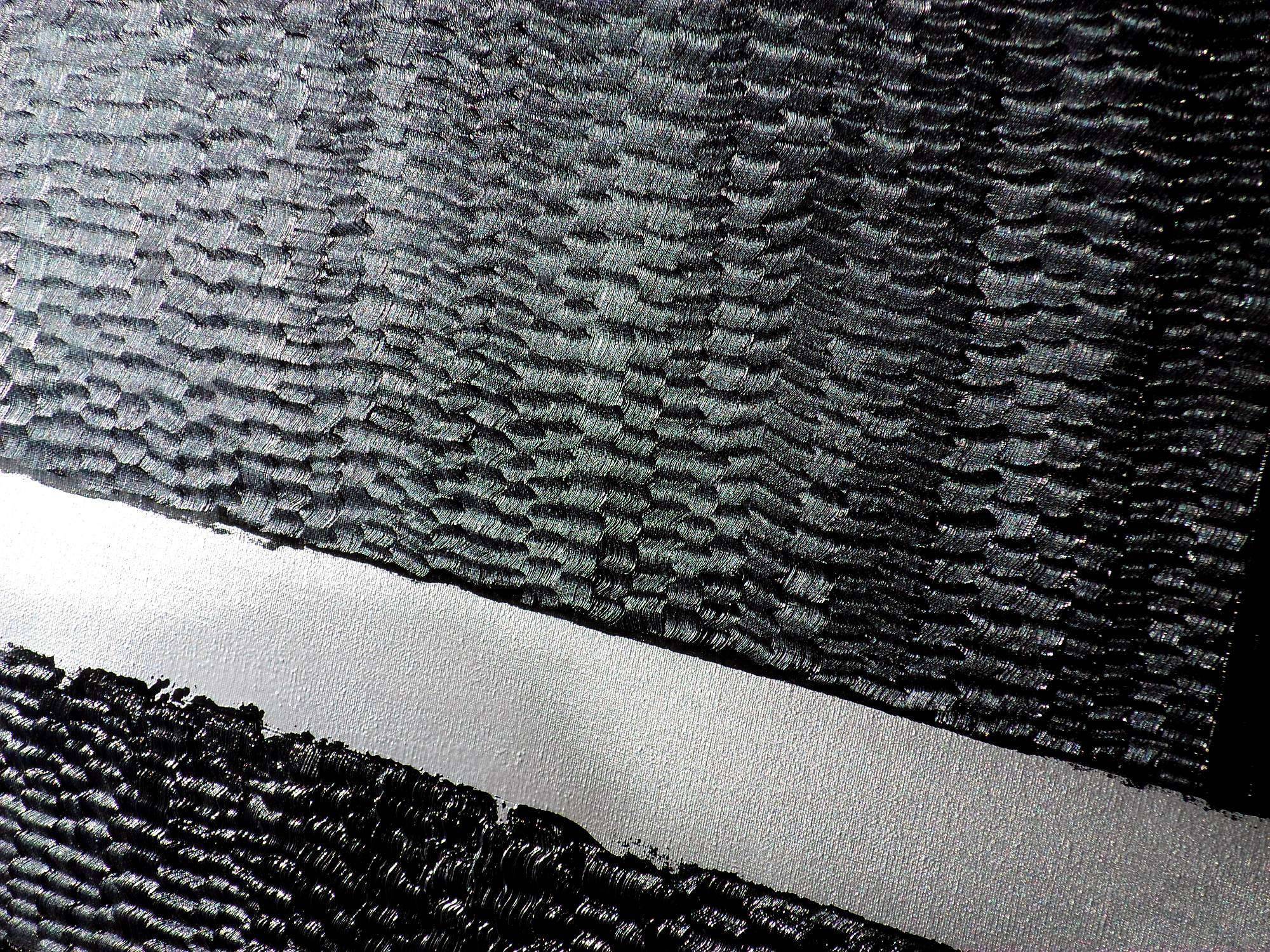 Obraz przyciąga uwagę swoją minimalistyczną elegancją. Dominuje w nim ciemna, głęboka czerń przeplatana z subtelnym srebrnym pasem, który jakby przecina kompozycję na pół. Faktura powierzchni pełna jest delikatnych, powtarzających się wzorów przypominających fale na spokojnej wodzie. Całość sprawia wrażenie tajemniczości, jakby skrywała jakąś niewidzialną opowieść. Atmosfera jest jakby pełna ciszy, spokoju, ale jednocześnie niepewności. Srebrna linia wydaje się być jak błysk światła w ciemności, jak okruch nadziei. Stopień harmonii i równowagi w tej pracy jest godny podziwu, a jednocześnie widz odczuwa subtelne napięcie. Technika impastowa użyta do stworzenia fal daje obrazowi trójwymiarowy efekt, niemalże zaprasza do dotknięcia. Wzory na powierzchni przywodzą na myśl niekończące się fale emocji, które wzbierają w sercu odbiorcy. Dla mnie, patrzenie na ten obraz to jak słuchanie nieznanej melodii, która jednocześnie wciąga i uspokaja. A jeśli miałby napisać coś dziecko—"O! To wygląda jak nocne niebo z kometą!" This artwork truly resonates with its viewers, offering a glimpse into an undefined world. Fascynujący!