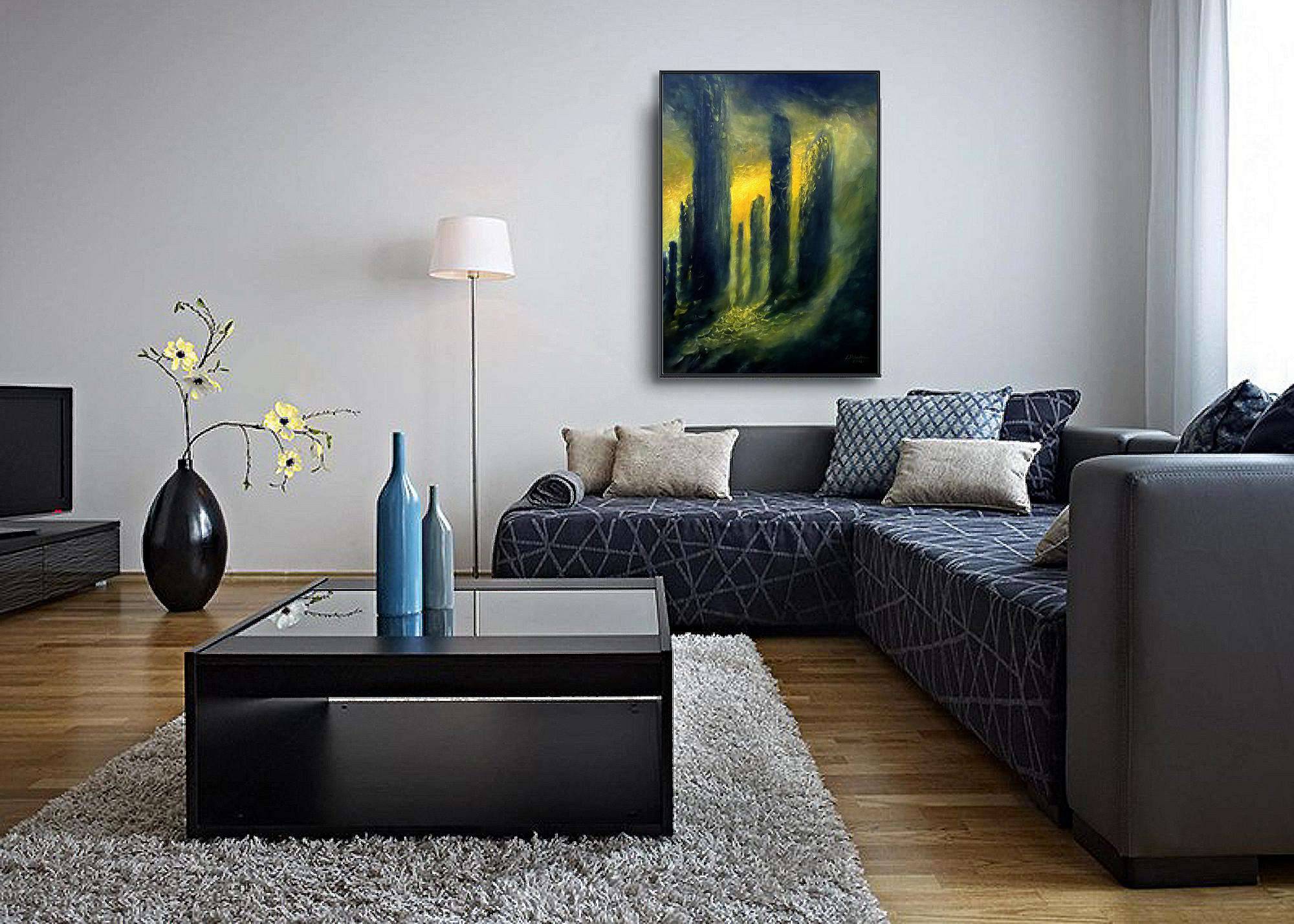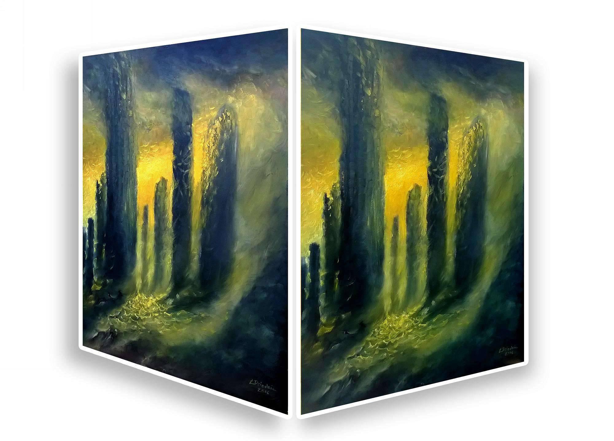 Obraz emanuje tajemniczością dzięki głębokim tonacjom zieleni i żółci, które mieszają się, tworząc niemal surrealistyczną scenerię. Strzeliste, niemal fantomowe sylwetki budynków wznoszą się ku niebu, nadając kompozycji pionowy rytm. Światło przelatuje przez mglistą atmosferę, tworząc efekt przypominający poranne promienie przedzierające się przez las. Artysta wprowadza nas w stan zadumy poprzez grę światła i cienia, co nadaje dziełu melancholijny nastrój. Technika, którą zastosował, to impast – grube, dynamiczne pociągnięcia pędzlem. Dzięki temu obraz zyskuje na wyrazistości i głębi. Dla kogoś, kto spojrzy na to dzieło, możliwe że pojawi się intrygujące pytanie: czy to koniec miasta, czy jego nowy początek? Może to być wizja przyszłości albo zapomniana przeszłość. Patrząc na ten obraz, czuje się niemalże smutek, a jednocześnie nadzieję, że po burzy zawsze przychodzi spokój. Myślę sobie – wow, to jest jak wejście do magicznej krainy! To magiczne. Czasem obraz mówi więcej niż słowa, a ta kompozycja zdecydowanie pozostawia widza z uczuciem tajemnicy i niedopowiedzenia. Dzięki śmiałemu połączeniu kolorów i kształtów dzieło przyciąga wzrok i skłania do zastanowienia nad własnymi emocjami.
