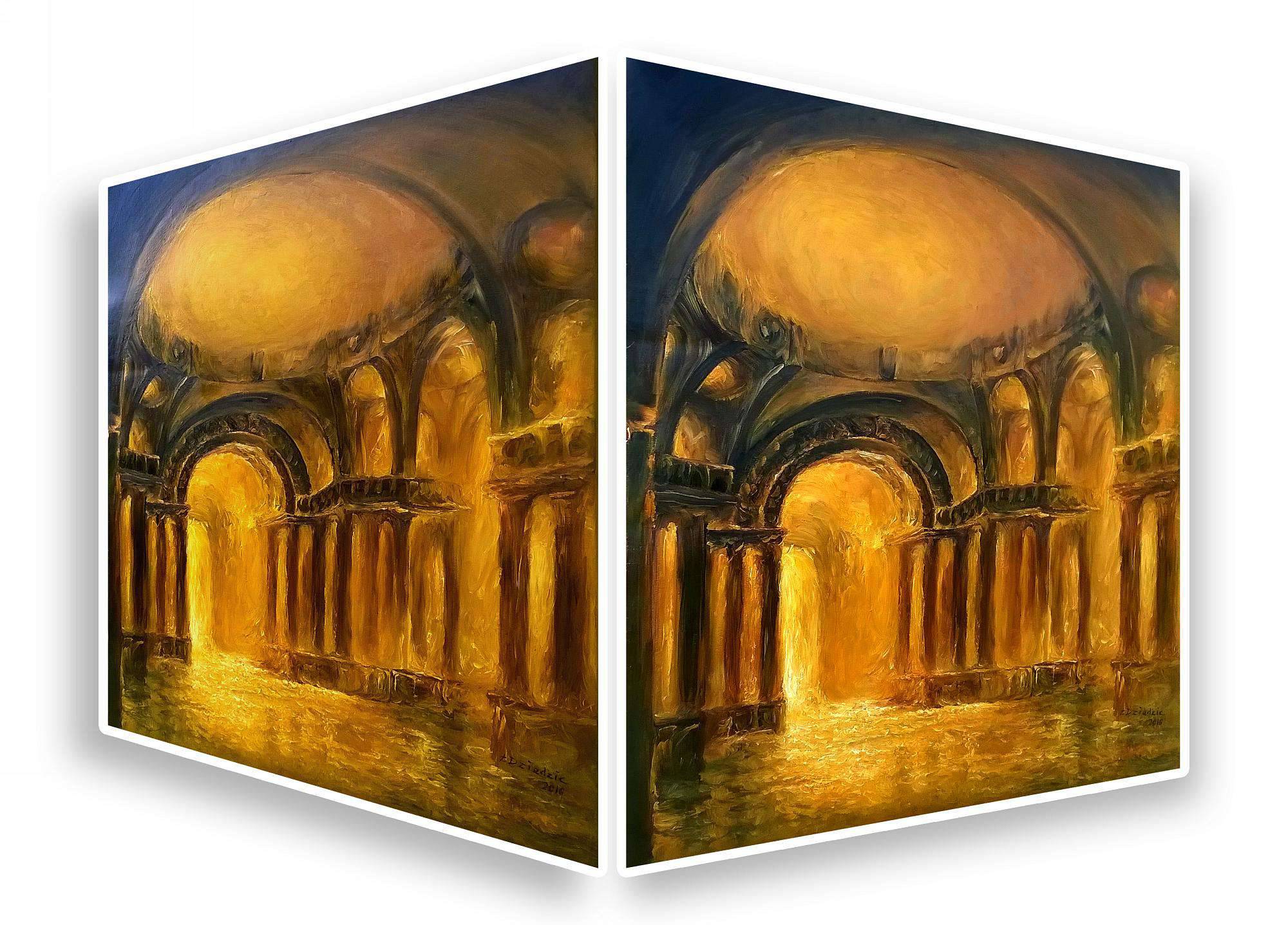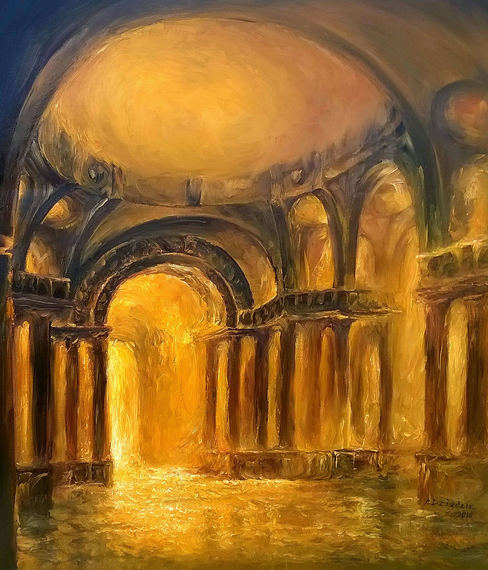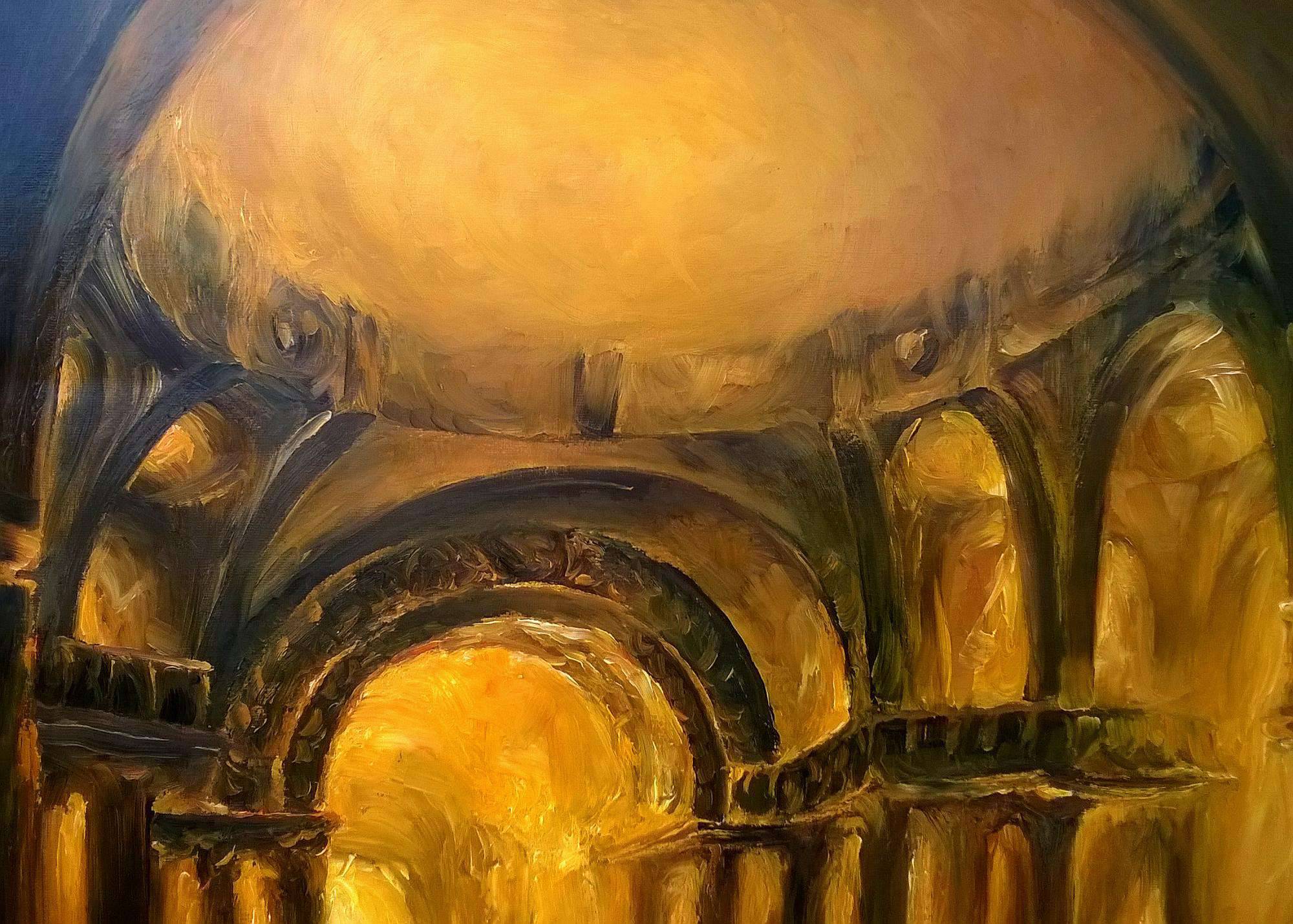 To dzieło emanuje złocistą poświatą, jakby słońce kładło się na starożytnych kamiennych kolumnach monumentalnej katedry. Odcienie bursztynu, złota i ciemnego brązu przewijają się w zakrzywionych, nieco rozmytych liniach, tworząc magiczną atmosferę tajemnicy. Kompozycja obrazu zdominowana jest przez centralny łuk, który optycznie prowadzi do wnętrza, sugerując przejście do innego świata. Styl artysty przypomina technikę impresjonistyczną, pełną dynamiki i miękkich pociągnięć pędzla, które dodają lekkości i pewnej nieuchwytności całemu przedstawieniu. Obraz przyciąga wzrok swą grą światła i cienia, a oglądający może poczuć nostalgię za minionymi epokami i podziw dla trwałości historii. Hej, a może tam jest potwór, bo wygląda jak z bajki! Dla mnie, dzieło to jest niczym portal, który kusi, by przejść na drugą stronę. Emocje wzbudza szybkie bicie serca, niemal jak magiczna podróż – nieodgadniona i fascynująca. To zdecydowanie captivating experience. Mogłoby połączyć w sobie poczucie spokoju i ekscytacji w równym stopniu.